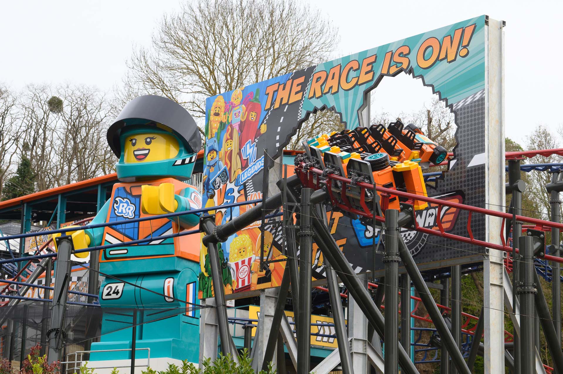 Roxie — a 30-foot-tall “minifigure” — watches over racers from the middle of the coaster’s layout.