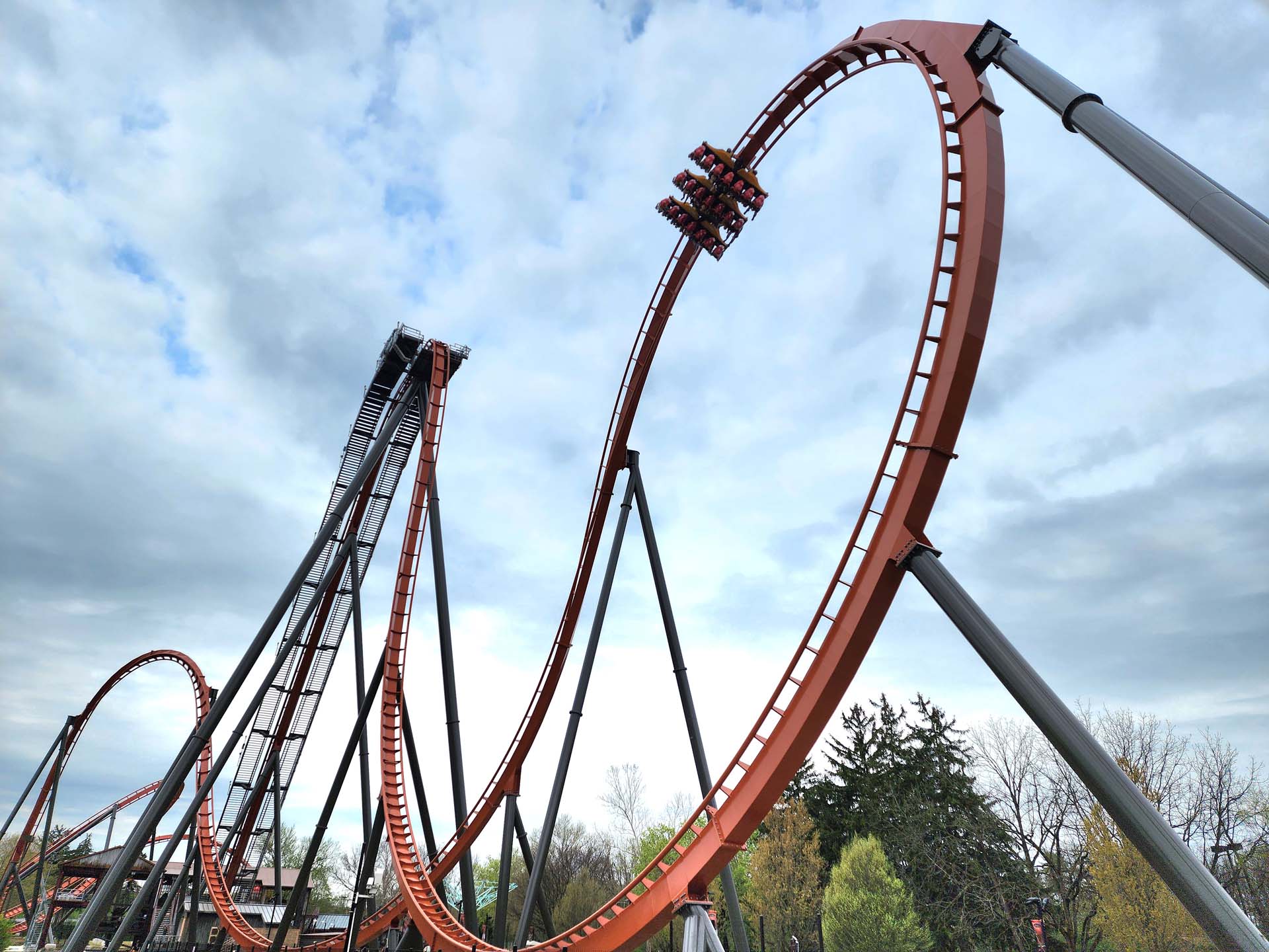 Iron Menace's station is decked out in details continuing the story line. Once riders are secured in one of two 21-passenger trains and begin to ascend the lift hill, the twisted steel of the 2,169-foot layout becomes visible below. Reaching the top of the 160-foot lift hill provides a quick but impressive view of Dorney Park's other roller coasters. An element unique to Iron Menace is the lack of a turn before the 152-foot drop — following the pause at the top to take in the view, there is an immediate plunge at 95 degrees into a melting pot of twisted steel. This results in exhilarating flight through four inversions, including an Immelmann, zero-G roll, inclined loop and corkscrew.