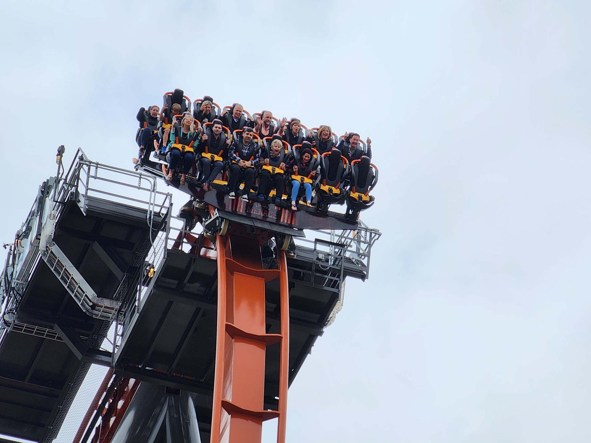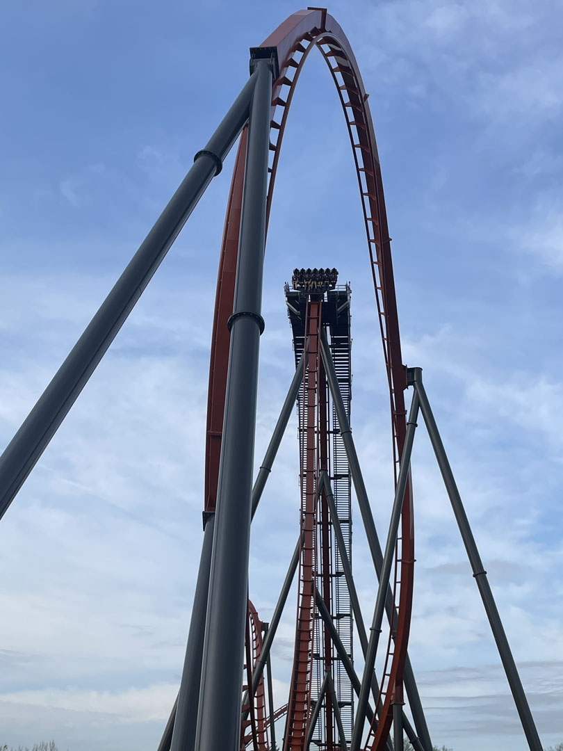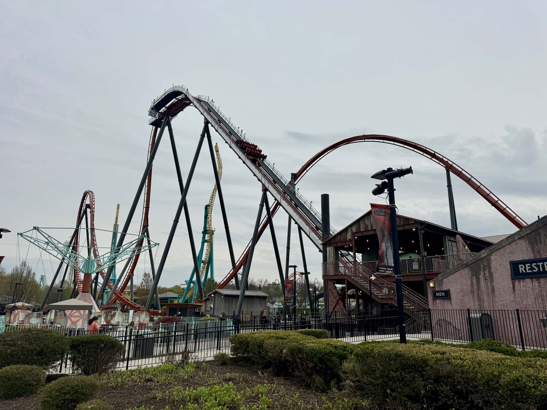 As with all dive coasters, the thrills begin with a noteworthy plunge to the ground and in the case of Iron Menace, beyond vertical.