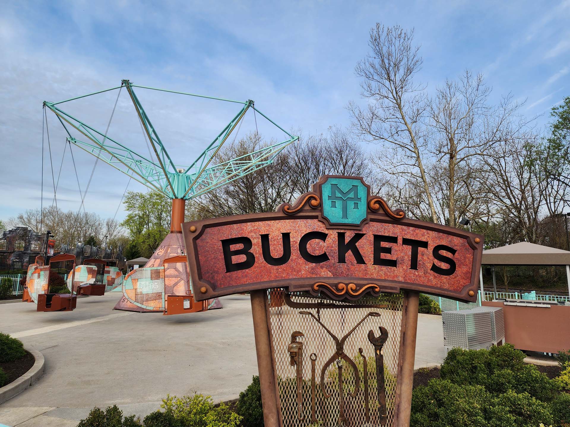 Courtesy of some detailed work on behalf of the park, the addition is more than just a ride — it's an elaborate story about an evil businessman named Hiram S. McTavish who opened a steel mill. Parkgoers approach the massive steel roller coaster by entering the steel yard, which was created by a dramatic transformation of the area with signage telling the story of McTavish. Existing rides like Possessed — an Intamin Impulse that once operated as Steel Venom at Six Flags Worlds of Adventure (and later, Geauga Lake) in Aurora, Ohio — and the Cedar Creek Flyers have been integrated, including a retheme of the latter into the MT Buckets. (It is worth noting that behind Iron Menace is a haunt attraction, Ghost in the Machine, which hints at the grim ending of the ill-fated steel workers who fell victim to McTavish's greed.)