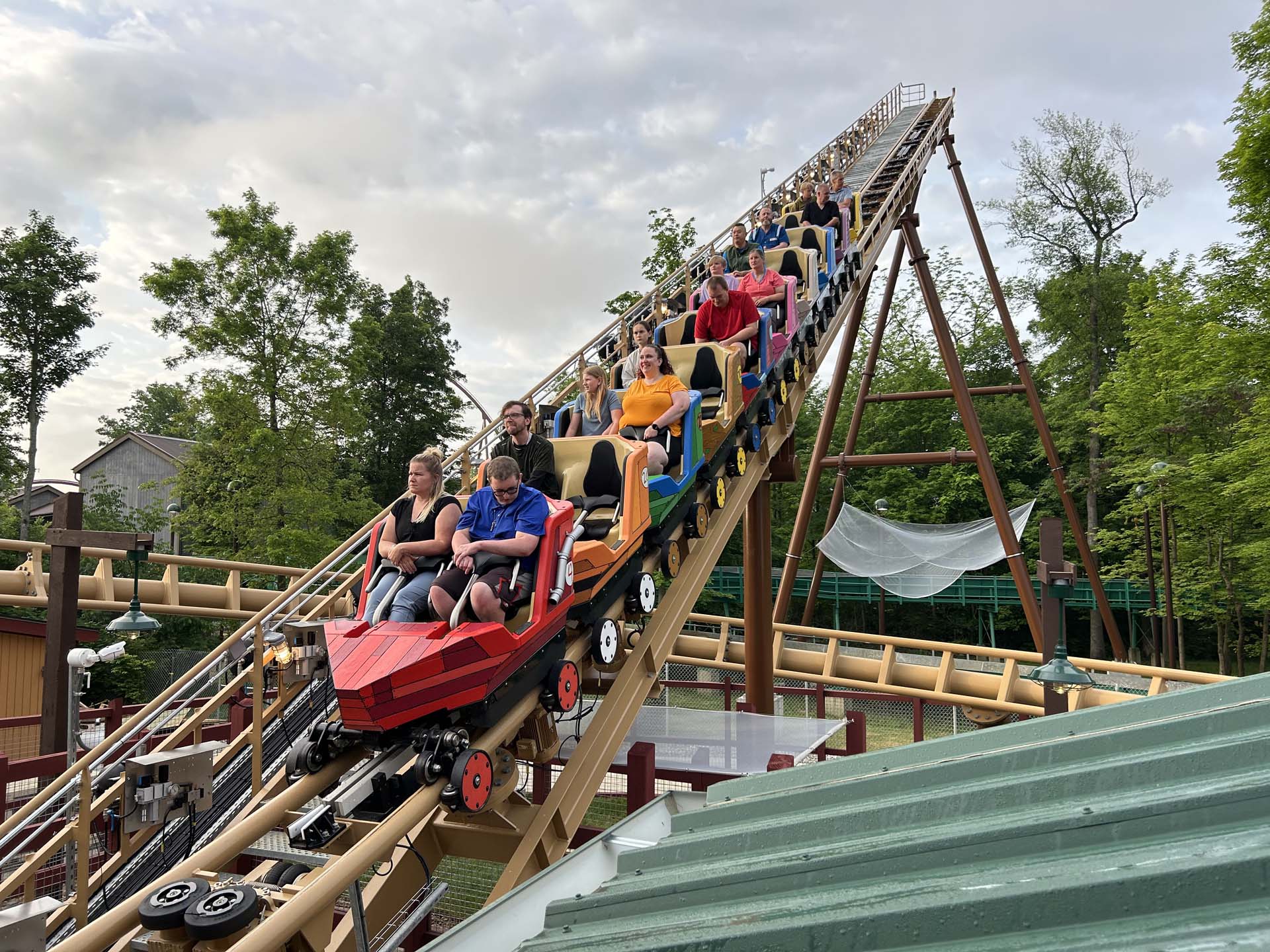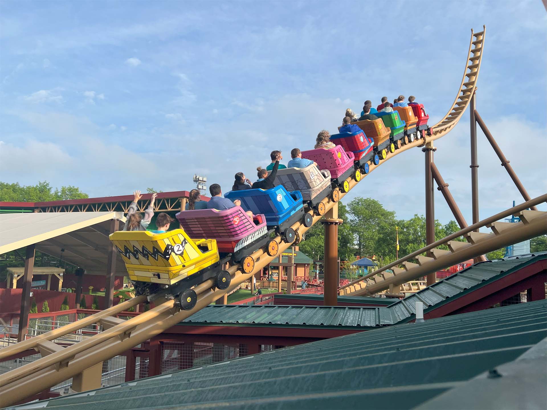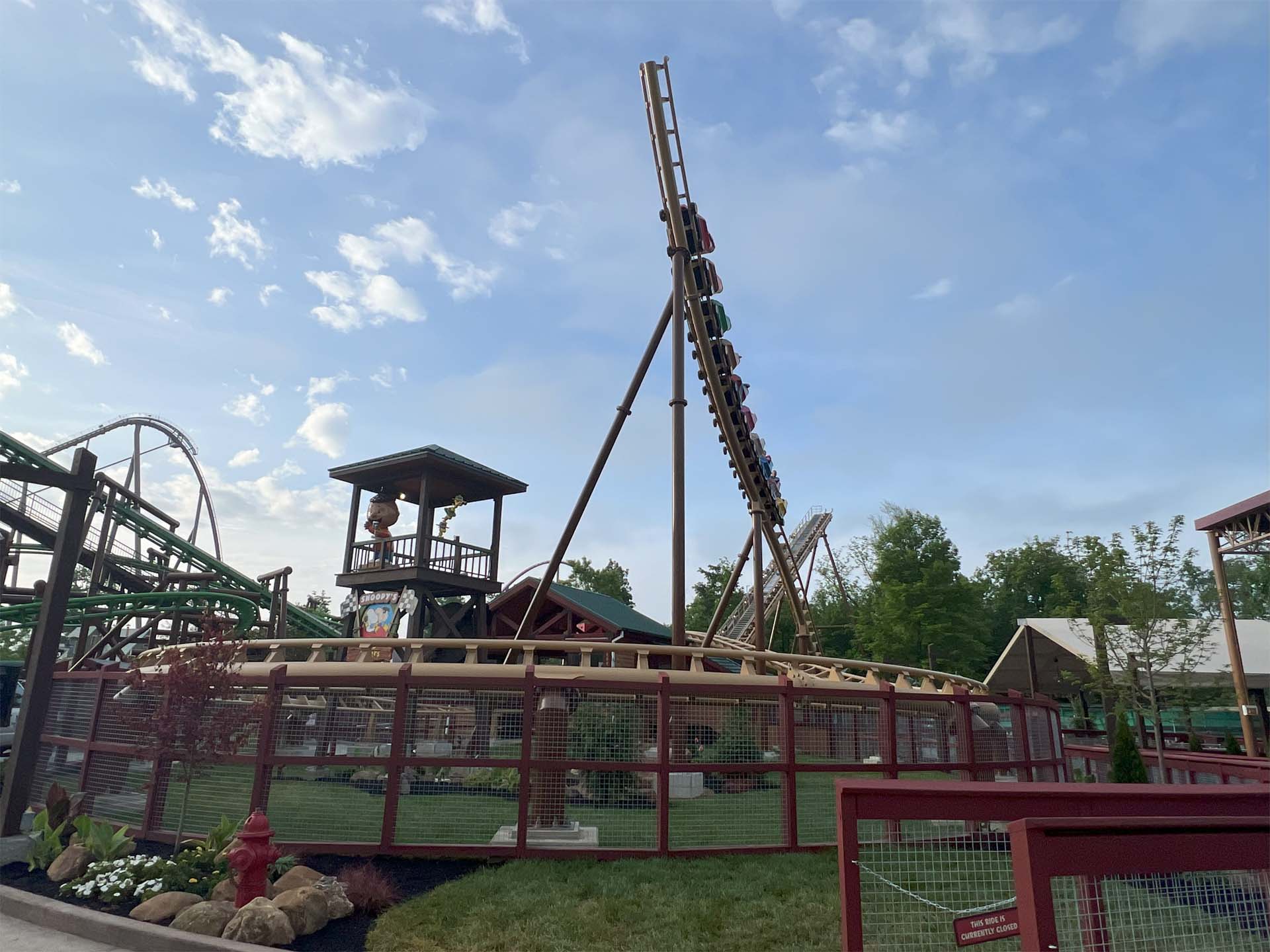 Joining an already impressive family lineup consisting of the E & F Miler Great Pumpkin Coaster, Vekoma’s Woodstock’s Air Rail and John Allen/Philadelphia Toboggan Company’s Woodstock Express, Snoopy’s Soap Box Racers is a Vekoma 208m Rebound family boomerang coaster.