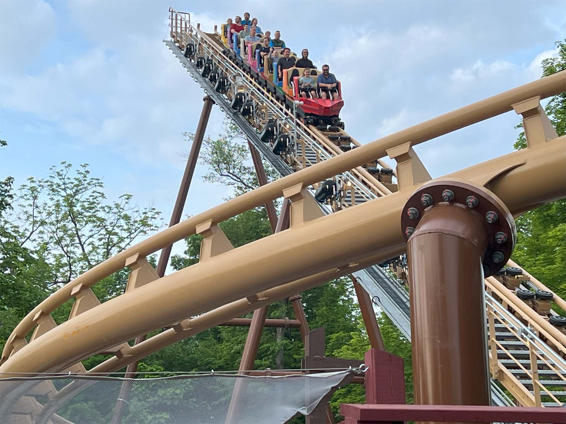 After a quick trip backward up the 75-foot lift hill, the race is on! Riders hit 37 mph around the figure-eight layout before hitting a spike at the other end of 672 feet of track and doing it all again in reverse.