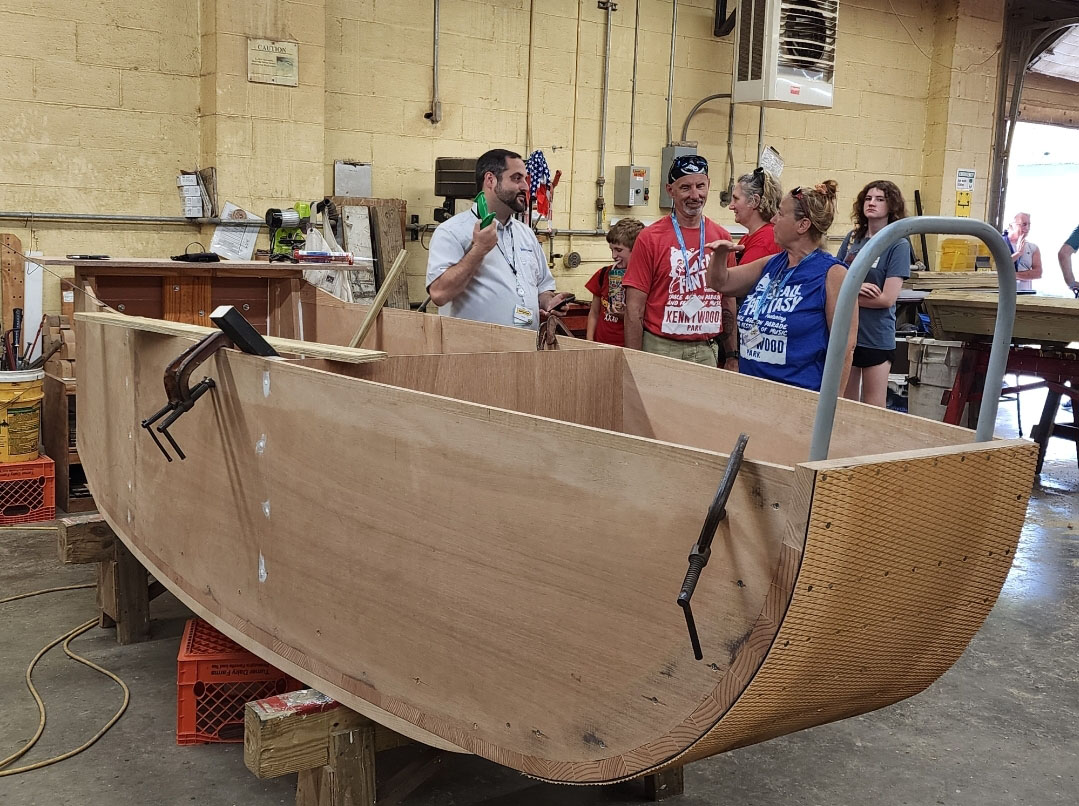 Kennywood’s general manager, Ricky Spicuzza, points out the features of an Old Mill boat being constructed in the maintenance shop.