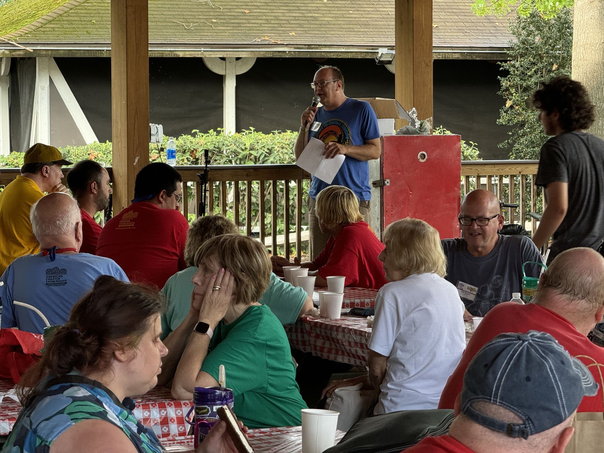 Kenny Kangaroo, wearing his “50th birthday” suit, greeted attendees during dinner, which consisted of pulled pork, chicken tenders, pasta, fresh fruit and more. Regional Rep Bill Linkenheimer III welcomed everyone and recognized key volunteers and his regional rep team. He also presented Ruby, Spicuzza and other Kennywood officials each with a KennyKon XXXV T-shirt and reminded attendees that Ruby is responsible for arranging all ERT and tours during ACE events in the park. Linkenheimer announced upcoming ACE Western Pennsylvania regional events and sent the 27 trolley winners on their way to get ready for the parade.