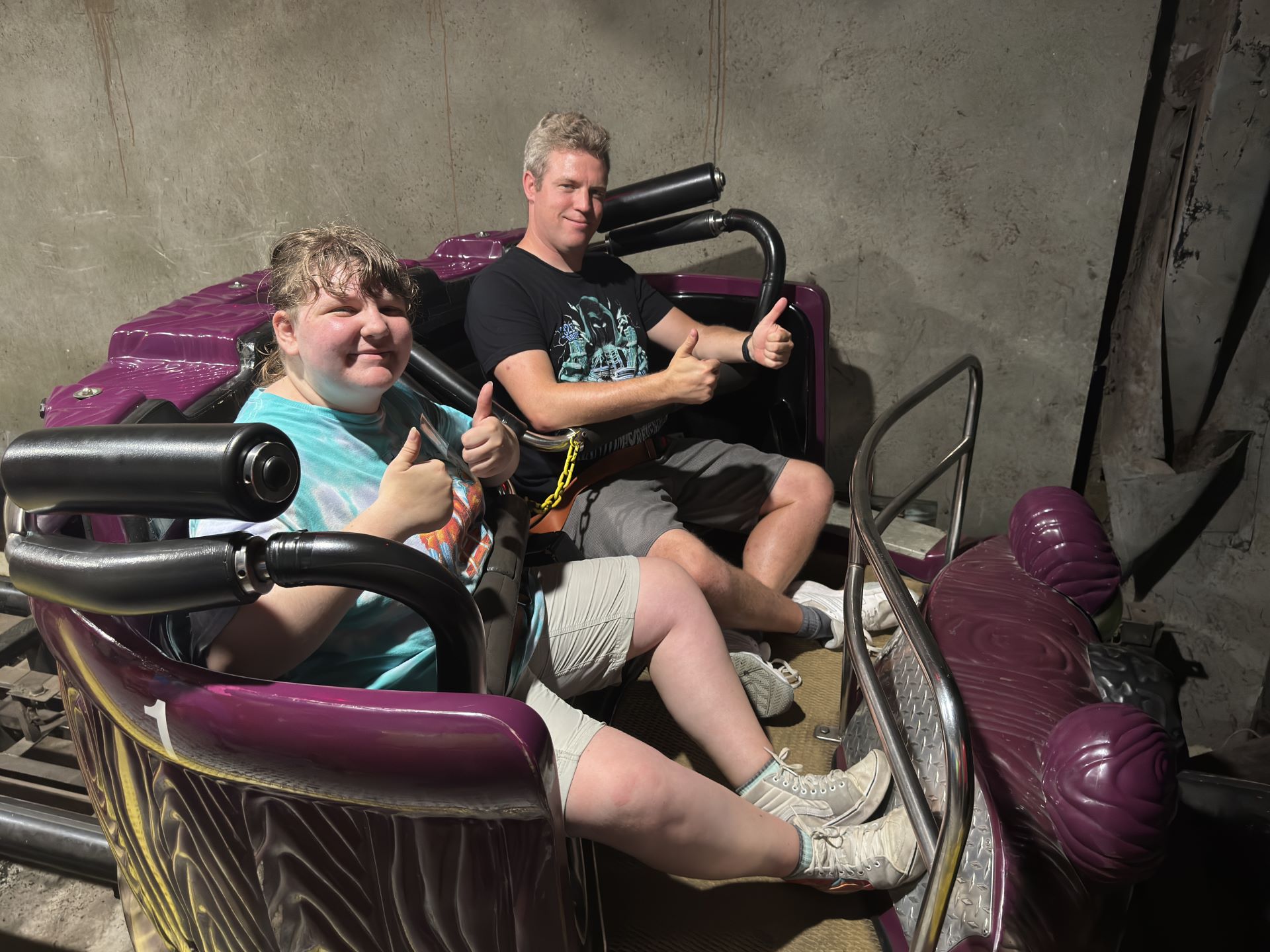 The Exterminator, with its theme of a factory overrun by mice being chased by an exterminator, is celebrating 25 years at the park. This indoor Reverchon spinning coaster benefited from the queue video being restored in 2024. Attendees were happy to see the return of Turtle, which closed in August 2023 for a preservation project. A group photo in front of Thunderbolt followed the end of ERT.