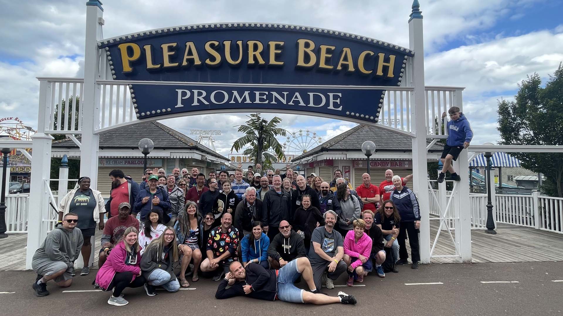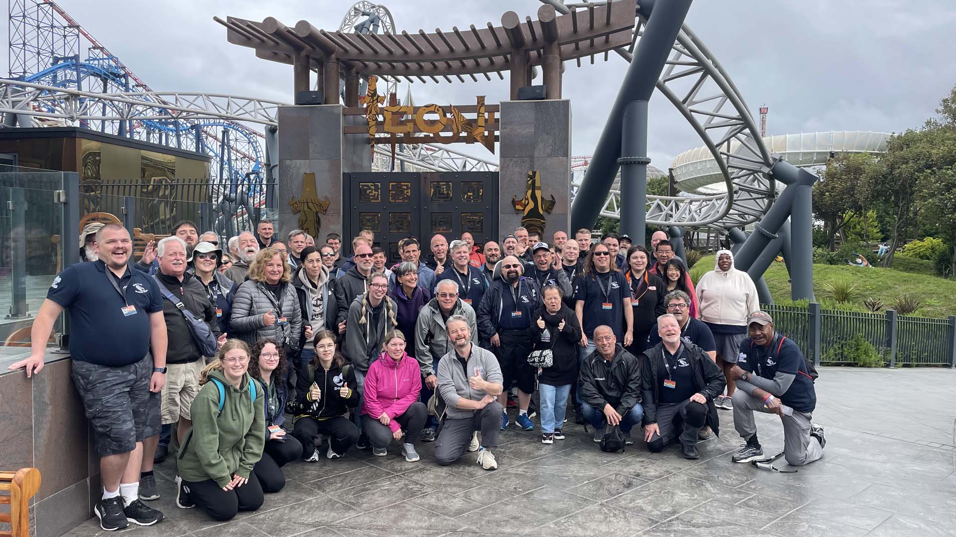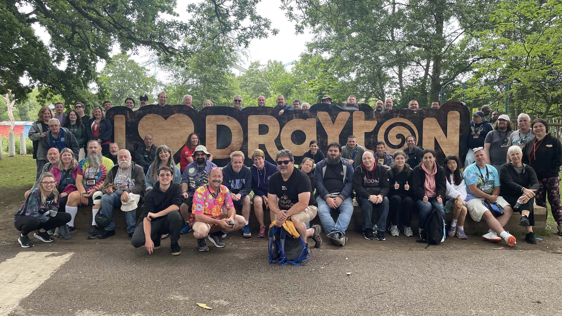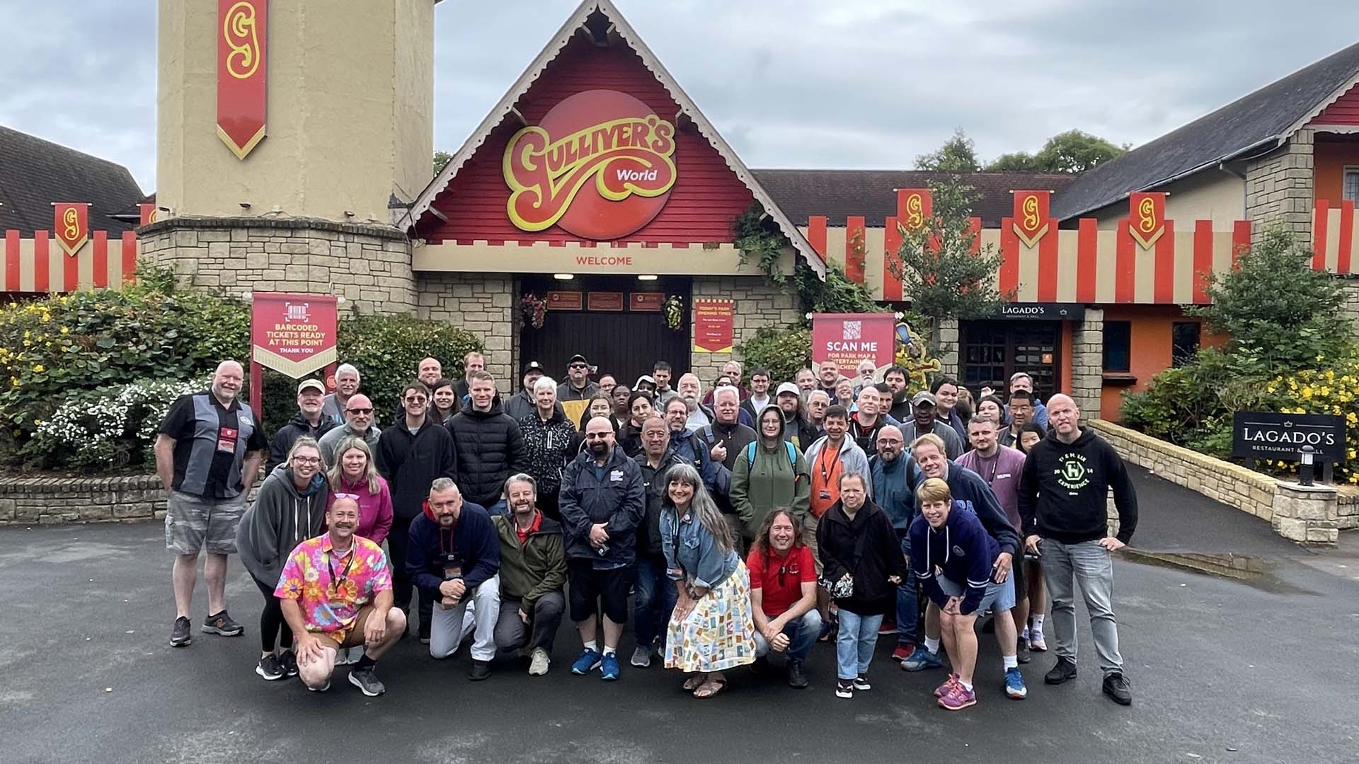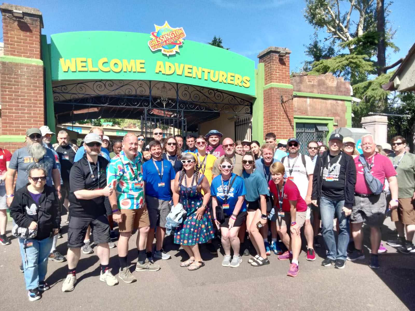 Attendees gather for a photo before entering the first park on the trip, Chessington World of Adventures.