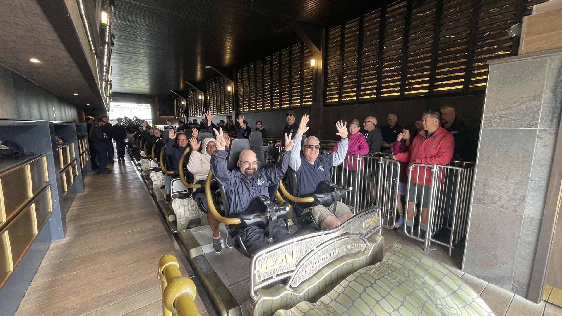 The next morning the destination was Paultons Park (Romsey, Hampshire, England), another of the United Kingdom’s family-focused parks. Although the park dates back to 1086, the amusements began in 1979. This was trip T-shirt day, so everyone wore their black T-shirts for a coffee discussion with park management followed by first rides on the new Tornado Springs spinning coaster. Afterward, the remainder of the park, including an extensive Peppa Pig land, was ours to explore. Again, a group lunch gave everyone the opportunity to swap tips for enjoying the park. At closing, a photo was taken before heading to the bus for the next hotel.