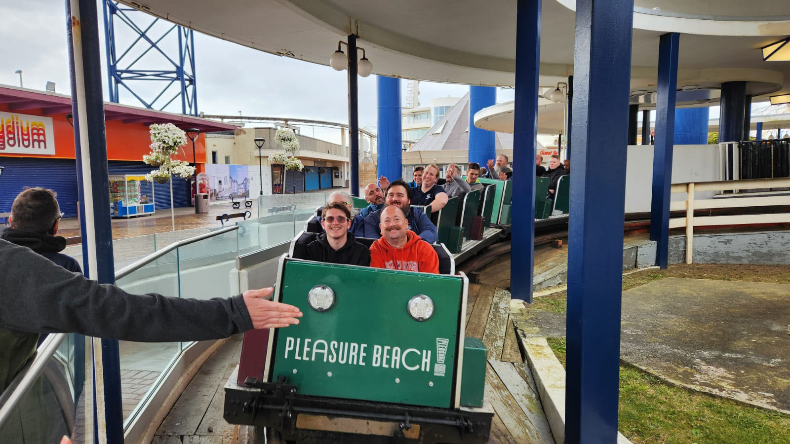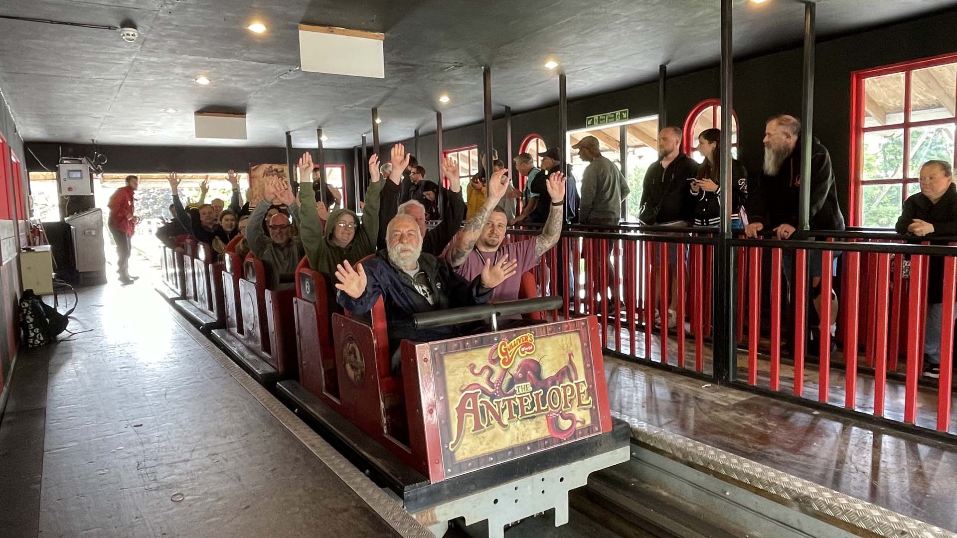 Attendees gather outside Gulliver’s Warrington for a brief visit and an opportunity to experience Antelope, its wood coaster.