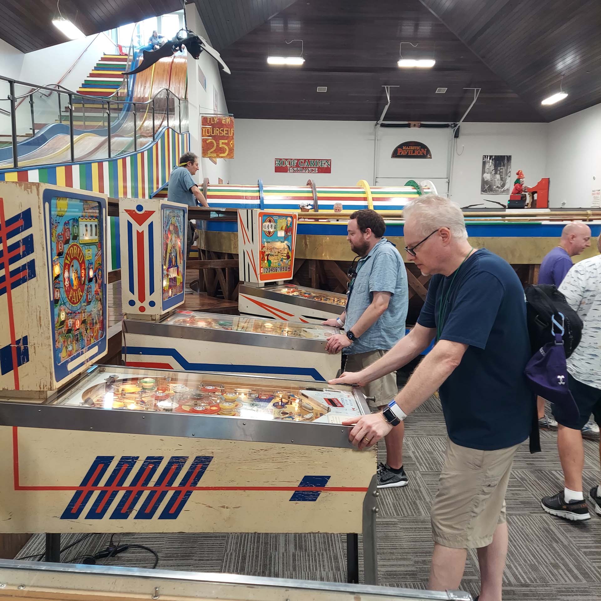 After ERT, the park opened to the public, and attendees made their way over to the Arnolds Park Funhouse Museum. There, ACEers could play vintage pinball and look at the park’s old wooden sugar bowl ride and old wooden fun house roller. The highlight of this visit was to race fellow ACE members down the original wooden fun house slide. Included in their wristbands for the day, attendees had access to not only the Arnolds Museum but also the Maritime Museum and the Iowa Rock and Roll Hall of Fame.