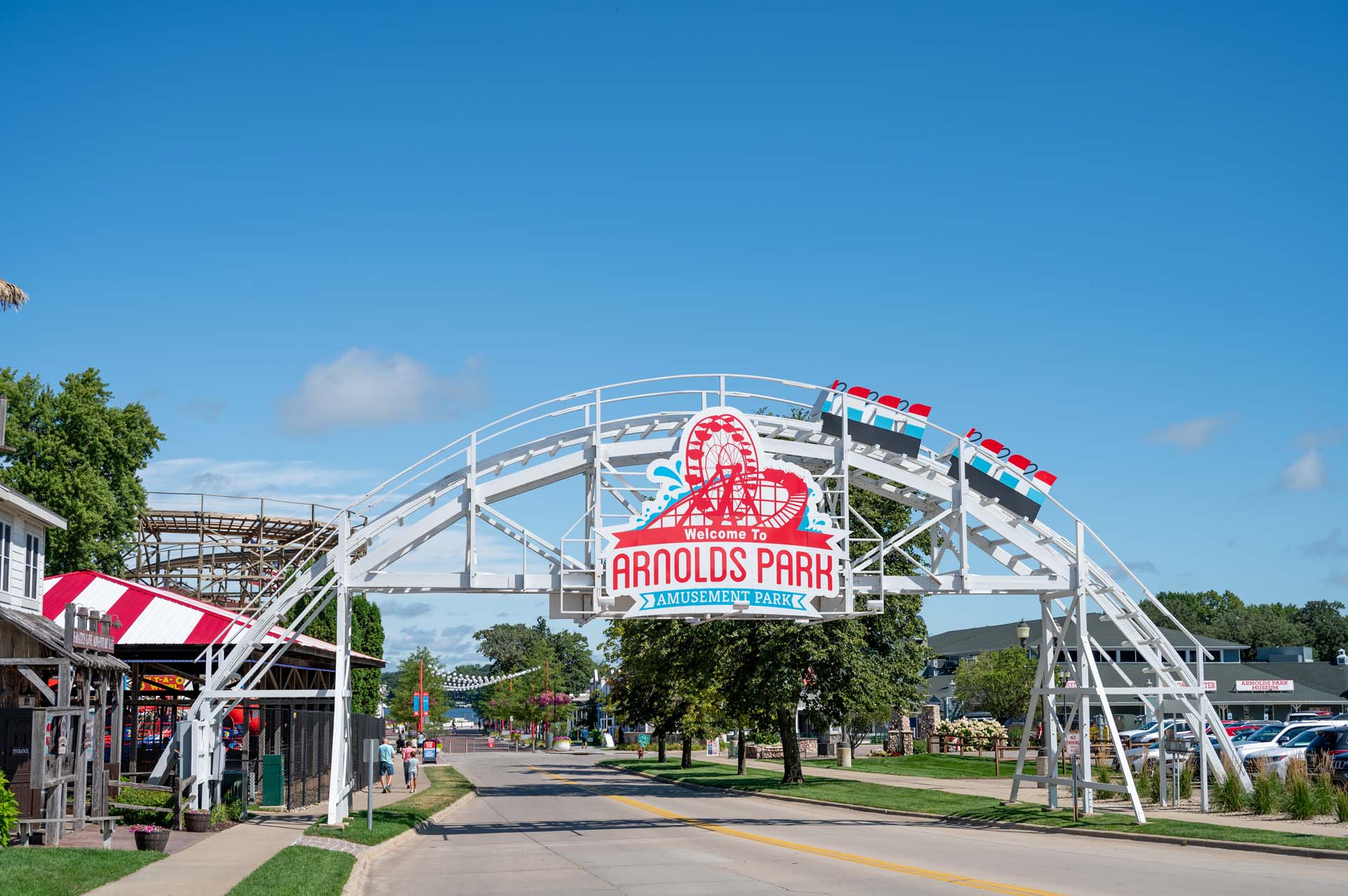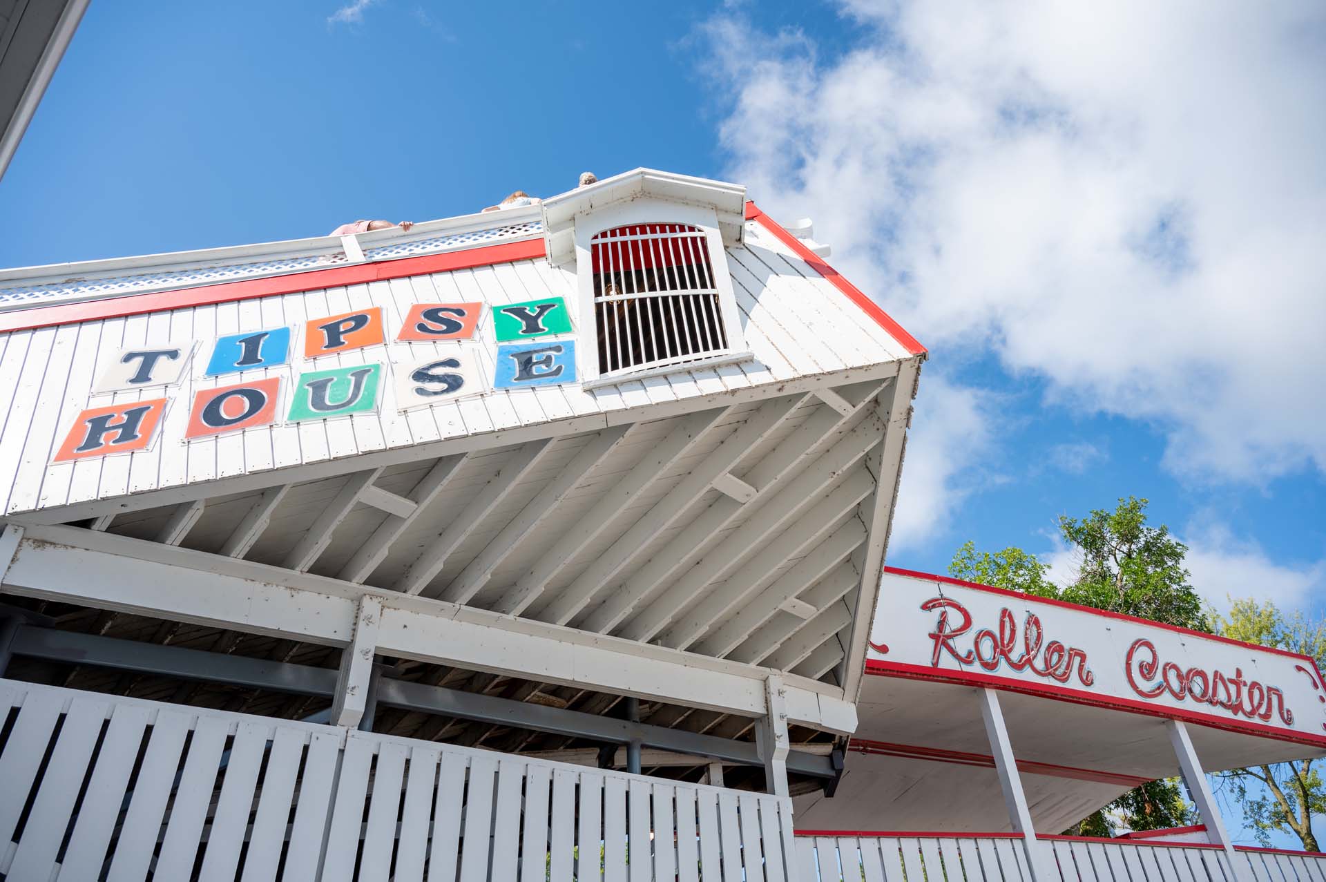 Arnolds Park is entered under the Legend roller coaster, adjacent to the unique Tipsy House.
