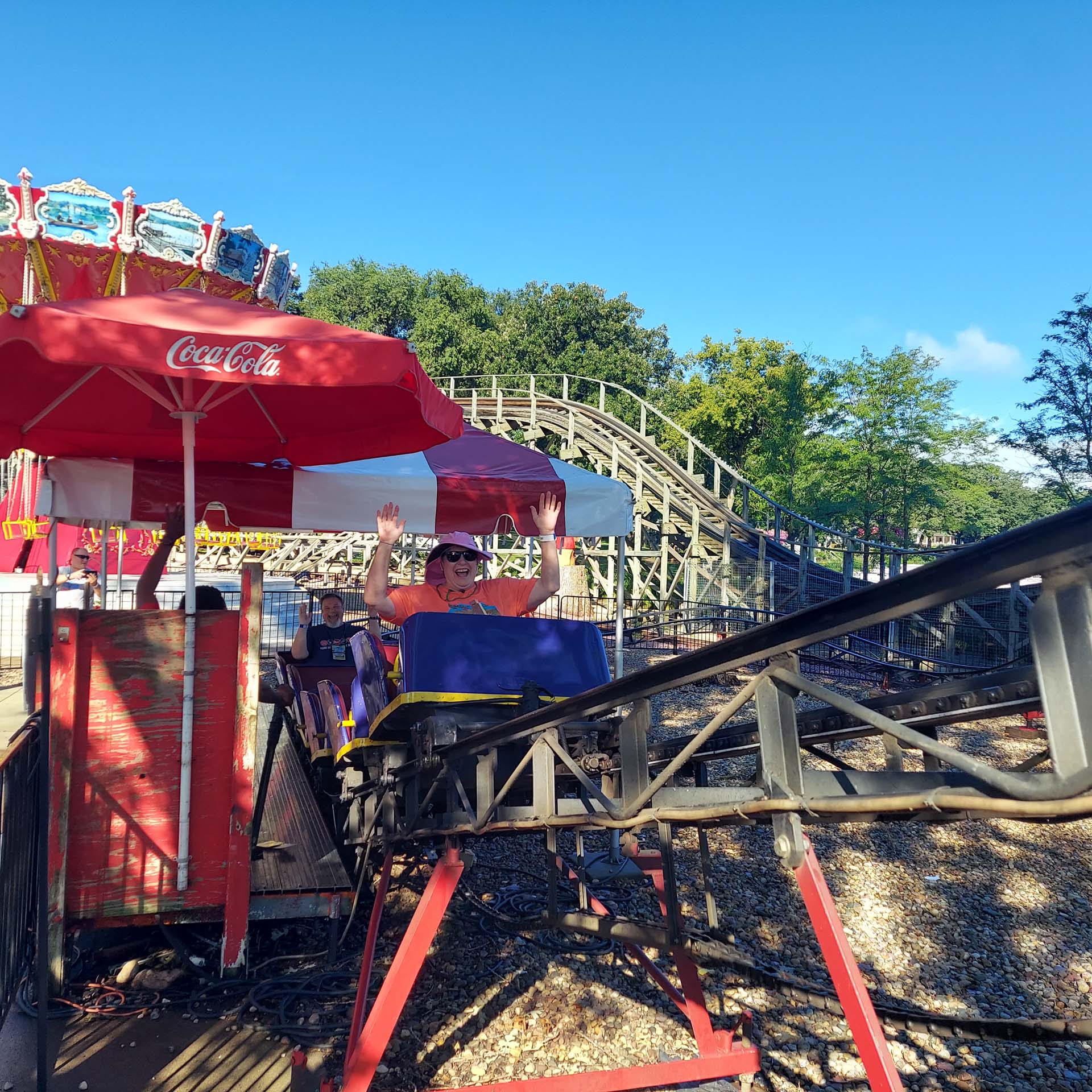 At 9 a.m., ERT began, and the star of the show was John Miller’s 1930 Legend. The coaster was running remarkably smoothly for a 91-year-old ride, thanks to the love and dedication the park continually bestows upon it. Little Coaster — a Miler Manufacturing kiddie coaster — was also opened during ERT and was a real treat for attendees, because adults normally are not able to ride. The line was long because only two adults at a time were permitted to ride, but everyone who wanted a ride got one. Even the park’s go karts, which are usually an upcharge attraction, were opened during ERT for a few laps. Finally, the park surprised ACEers with one more attraction — the Herschell Mad Mouse relocated most recently from Joyland in Lubbock, Texas.