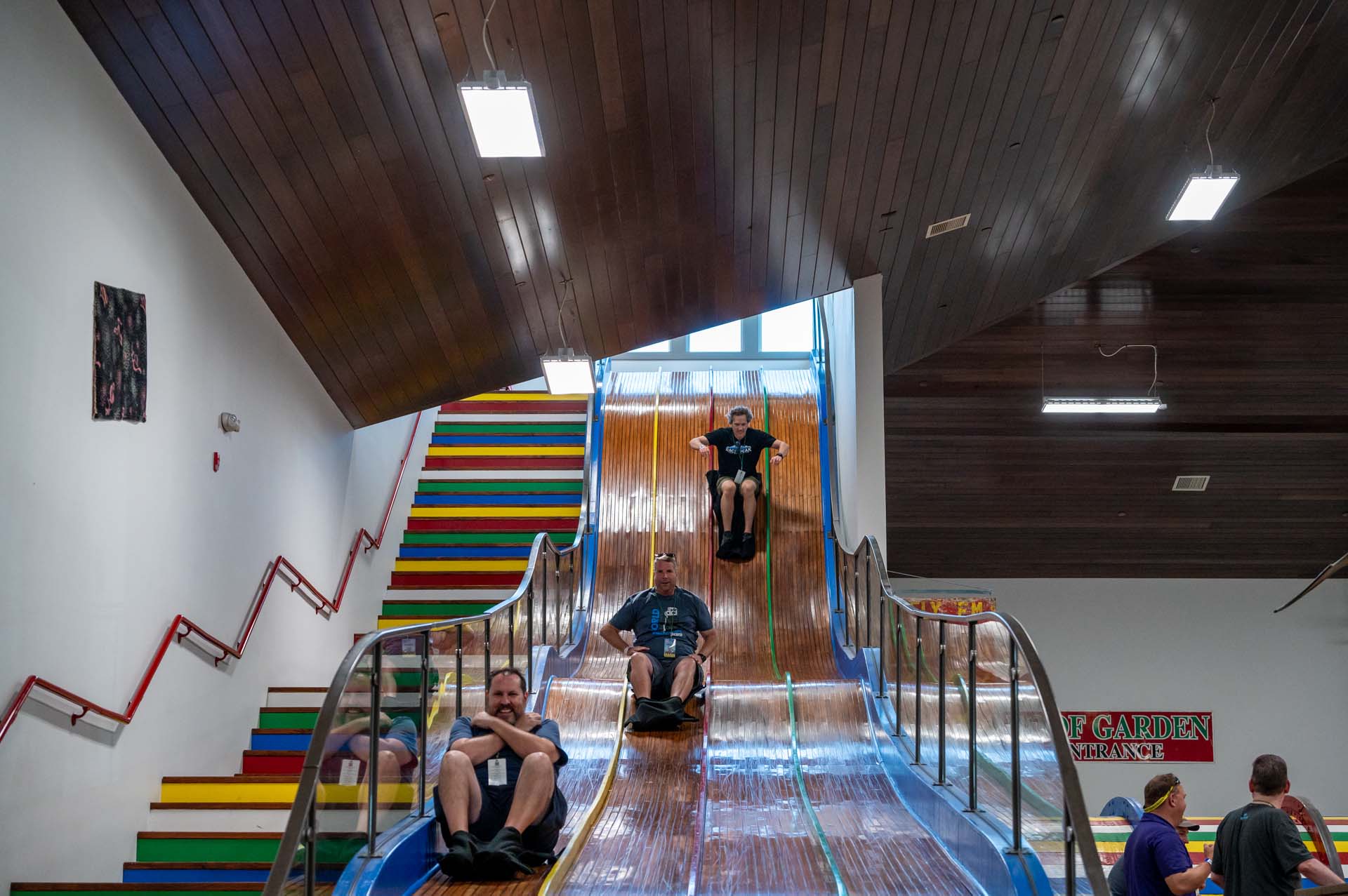 At the Arnolds Park Funhouse Museum, attendees raced each other down a preserved wooden fun house slide and played vintage pinball machines.