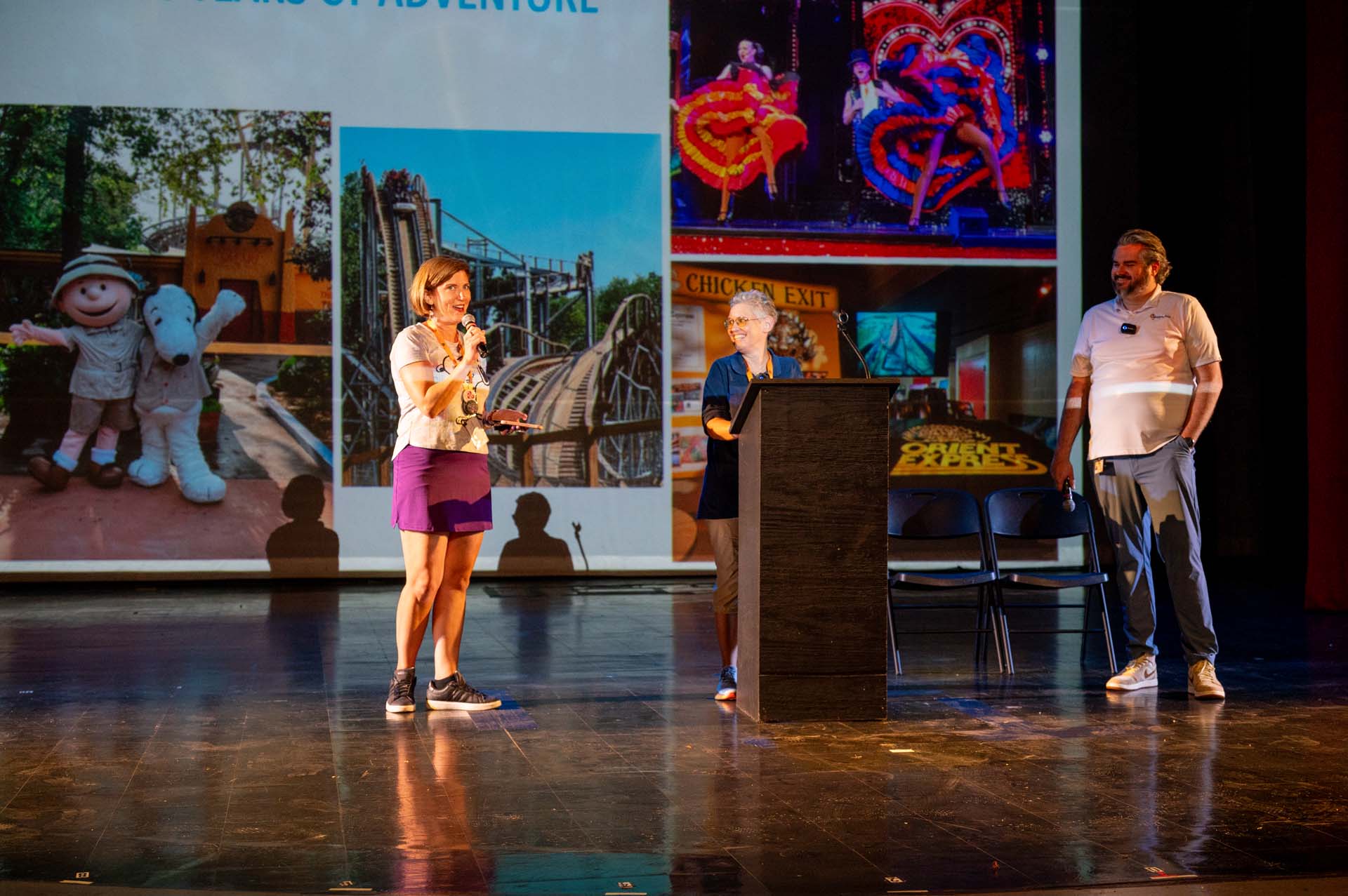 A later treat was a park history presentation (and an ACE Ride With Us podcast) in the Tivoli Music Hall by ACE member and former member of the region’s regional rep team Jennifer Lovesee-Mast. Lovesee-Mast is also the unofficial historian of Worlds of Fun and founder of worldsoffun.org. Communications Manager Brian McGannon introduced Lovesee-Mast, whose presentation covered Worlds of Fun’s history from park construction in 1971 to its opening in 1973 with three roller coasters to its 50th anniversary in 2023. Gardner thanked McGannon, Lovesee-Mast and Rick Fiedler, Worlds of Fun’s vice president and general manager, for their knowledge and enthusiasm for the park and its rides.
