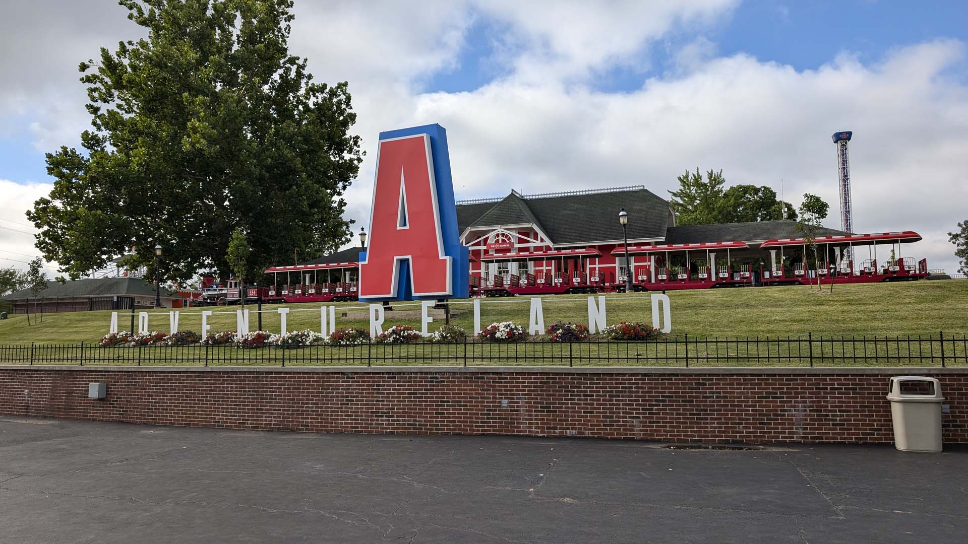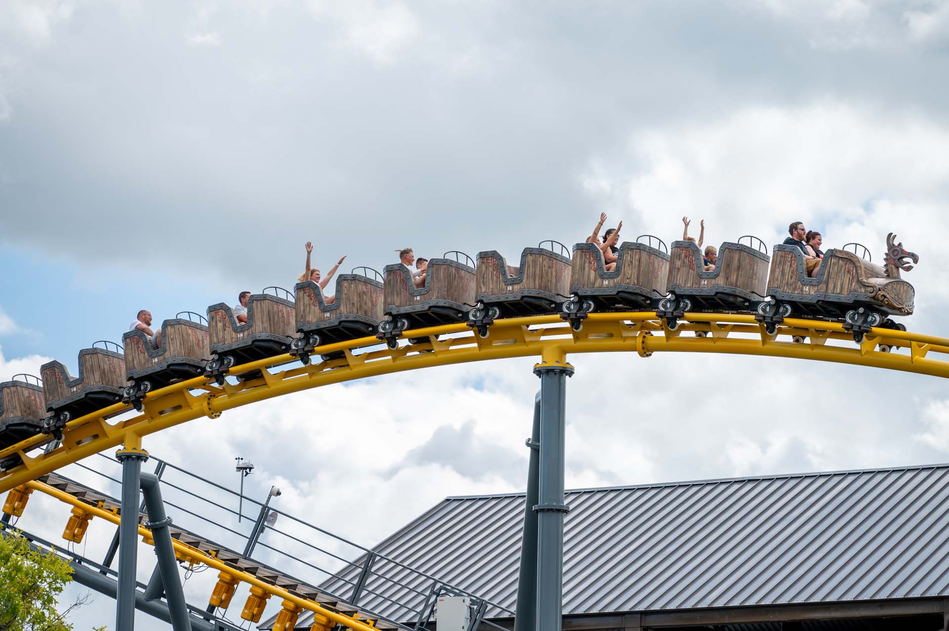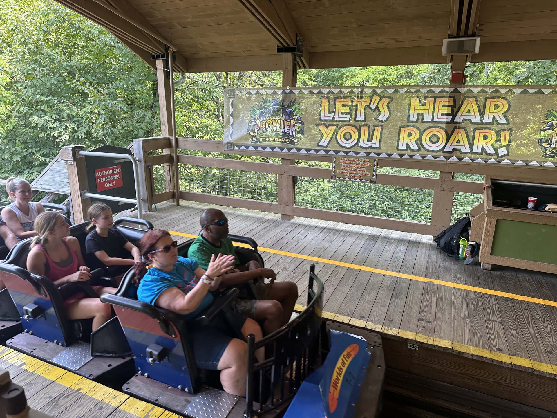 Day Two began early, around 100 miles southwest of Waterloo, at Adventureland, which is celebrating its 50th anniversary in 2024. Assorted breakfast items greeted attendees, and ERT began at 8:30 on another hot, humid day, but the heat was lessened by Adventureland’s many large shade trees. Included in ERT were Dragon Slayer (S&S 4-D Free Spin), Flying Viking (Zamperla Junior Coaster, which opened in 2023 and is intertwined with Draken Falls, the log flume), The Monster (Gerstlauer Infinity coaster) and The Underground (Custom Coasters International’s totally enclosed wood dark ride-coaster). This last had been reimagined and reopened in May and drew much attention. What a way to start the day!
