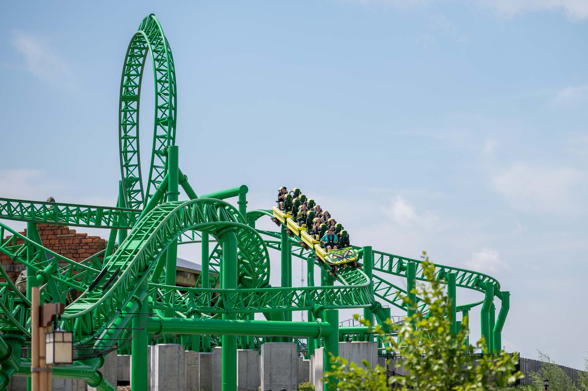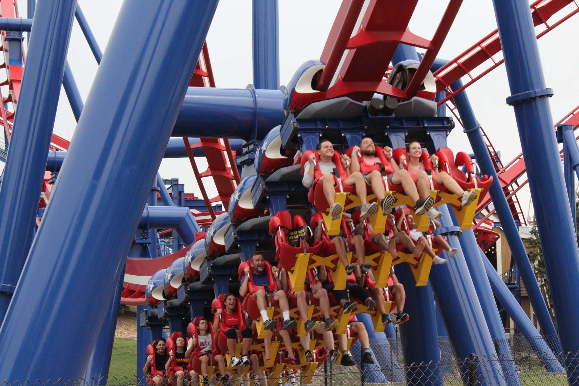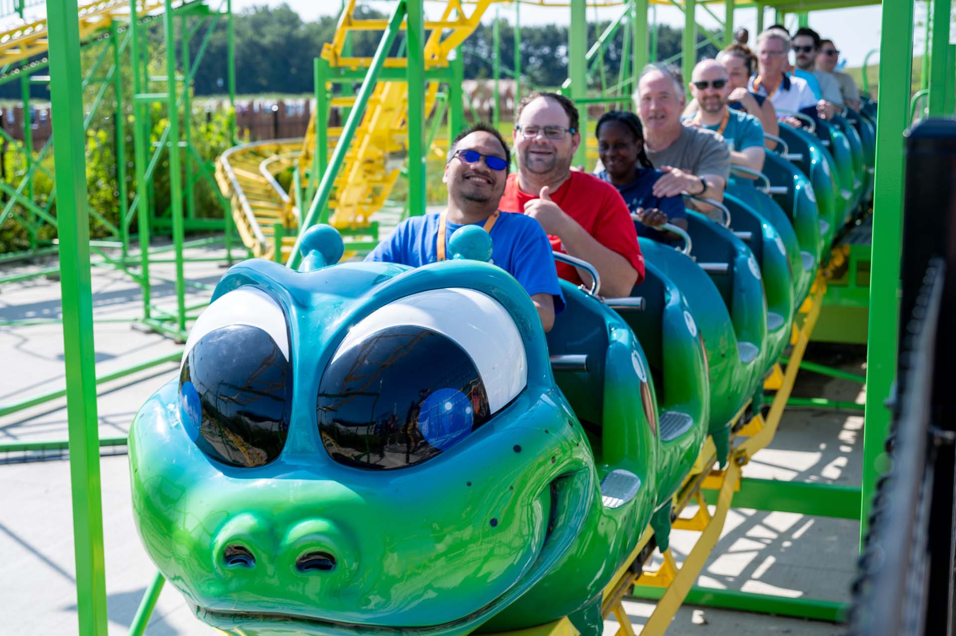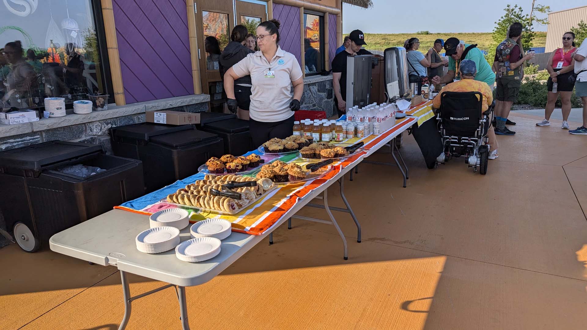 Day Two began early, around 100 miles southwest of Waterloo, at Adventureland, which is celebrating its 50th anniversary in 2024. Assorted breakfast items greeted attendees, and ERT began at 8:30 on another hot, humid day, but the heat was lessened by Adventureland’s many large shade trees. Included in ERT were Dragon Slayer (S&S 4-D Free Spin), Flying Viking (Zamperla Junior Coaster, which opened in 2023 and is intertwined with Draken Falls, the log flume), The Monster (Gerstlauer Infinity coaster) and The Underground (Custom Coasters International’s totally enclosed wood dark ride-coaster). This last had been reimagined and reopened in May and drew much attention. What a way to start the day!
