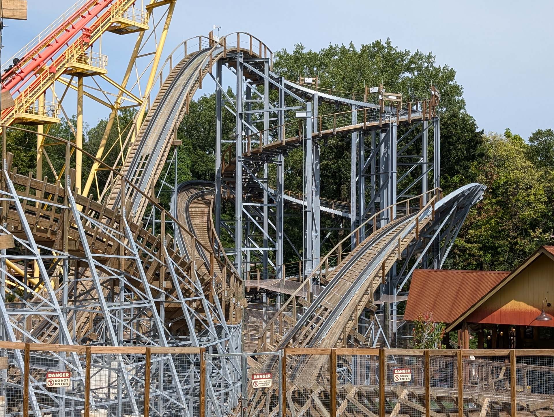 Day Three began with ERT on Mamba (an out-and-back steel coaster from Morgan), Timber Wolf (a wood coaster from Dinn) and Autobahn (bumper cars). Both the park and the waterpark (Oceans of Fun) opened at 11, but at that time attendees were hustling to the meetup spot to begin the Zambezi Zinger BTS tour. The number of twists and curves to the track was amazing to see up close and was something that would be impossible to appreciate while one was riding. The tunnel was an unusual shape, and attendees noticed the hilly terrain.