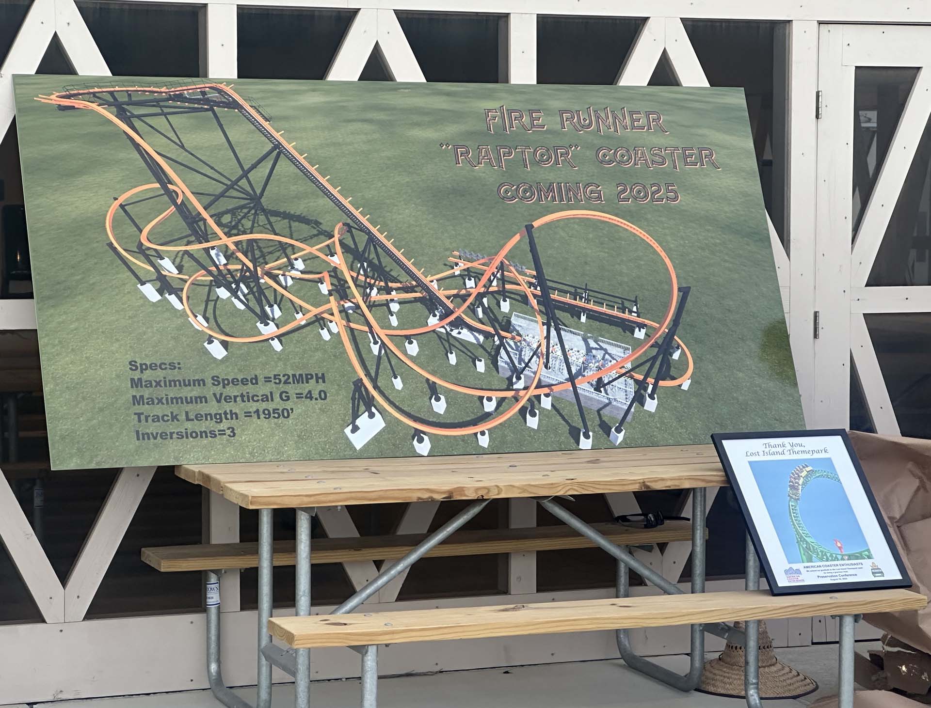 Appearing at the buffet dinner and park presentation later were some of the themed costumed characters who waited with attendees to hear about the park’s next attraction. ACE Events Director Steve Berto and Communications Director Derek Perry presented Eric Bertch, park owner and general manager, a photo of Matugani as a token of ACE’s appreciation for the park’s hospitality. A long, rectangular covered object was unveiled to show the layout of Fire Runner, a “Raptor” single-rail coaster coming in 2025 from Rocky Mountain Construction. Thanks to Lost Island for including its big news during ACE’s Preservation Con!