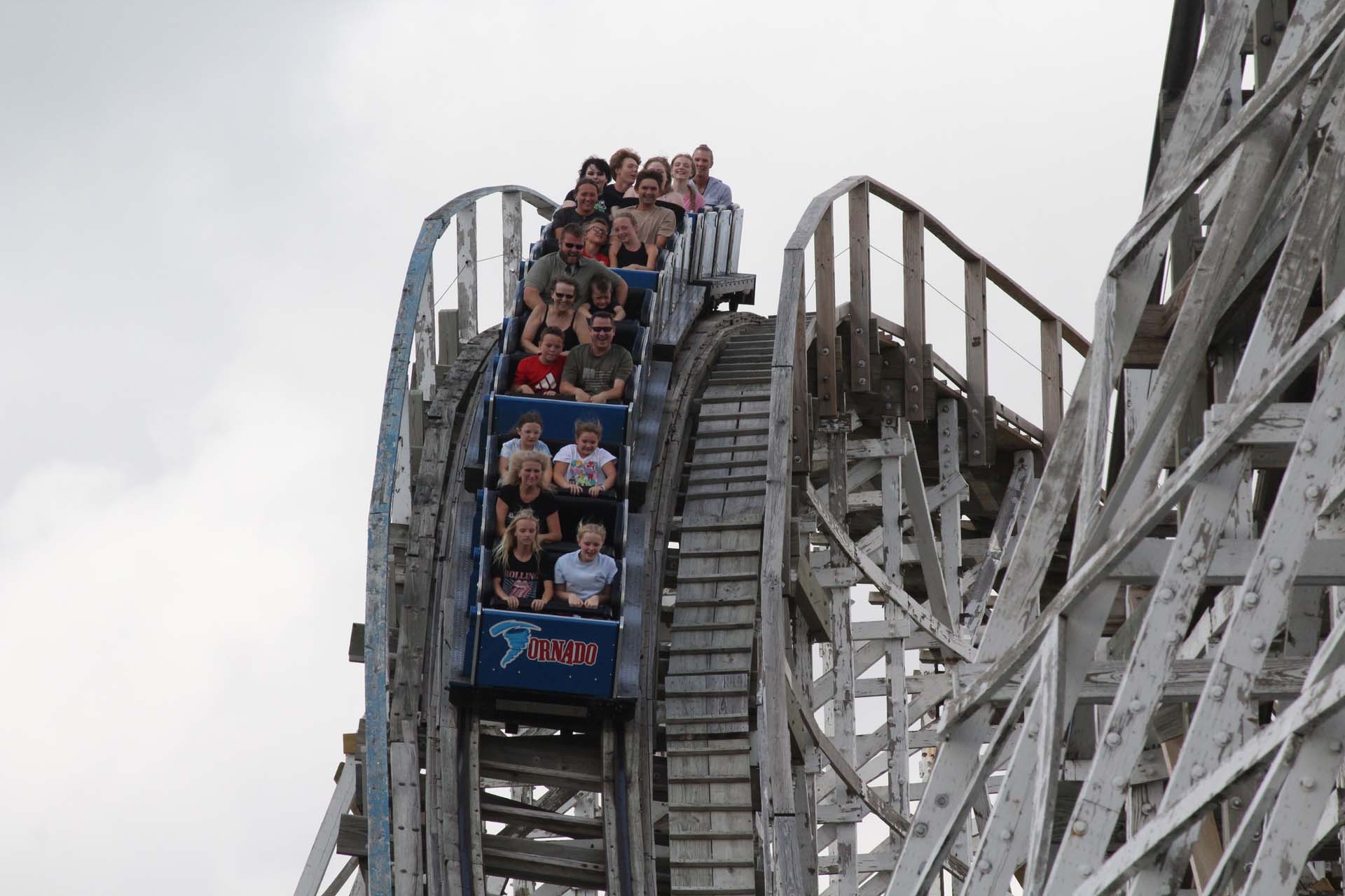 The land occupied by Adventureland was an airport in 1927. Park construction began in the early 1970s, and a tornado (which inspired the name of the coaster) delayed the park’s opening in 1974. Tornado opened in 1978 and the Giant Sky Wheel in 1991; a large expansion followed in 1993. Adventure Bay Waterpark opened in 2008, and Palace Entertainment acquired Adventureland in 2021.