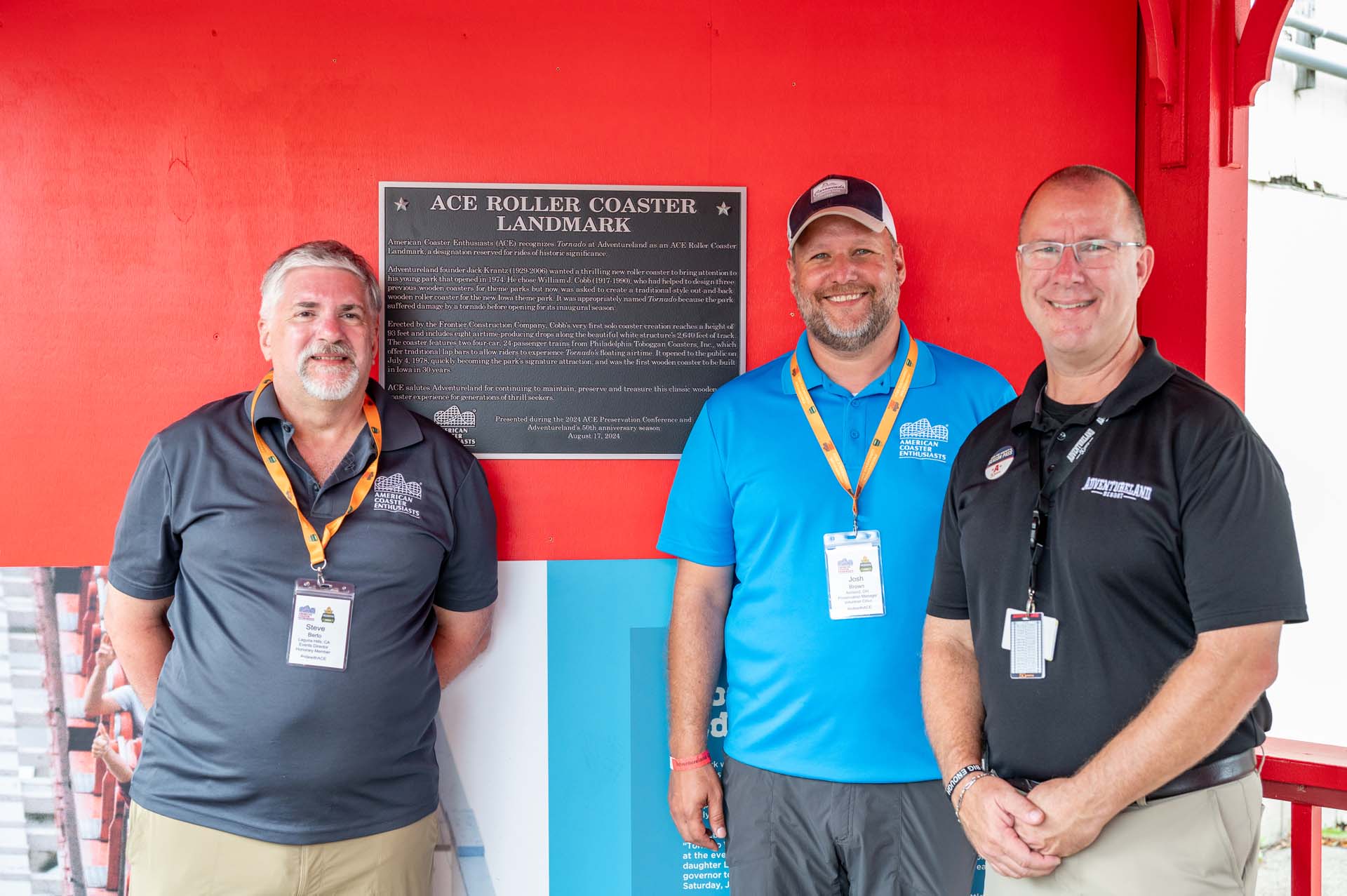 Steve Berto, Josh Brown and Adventureland’s Mike Lusky admire the ACE Roller Coaster Landmark plaque for Tornado.