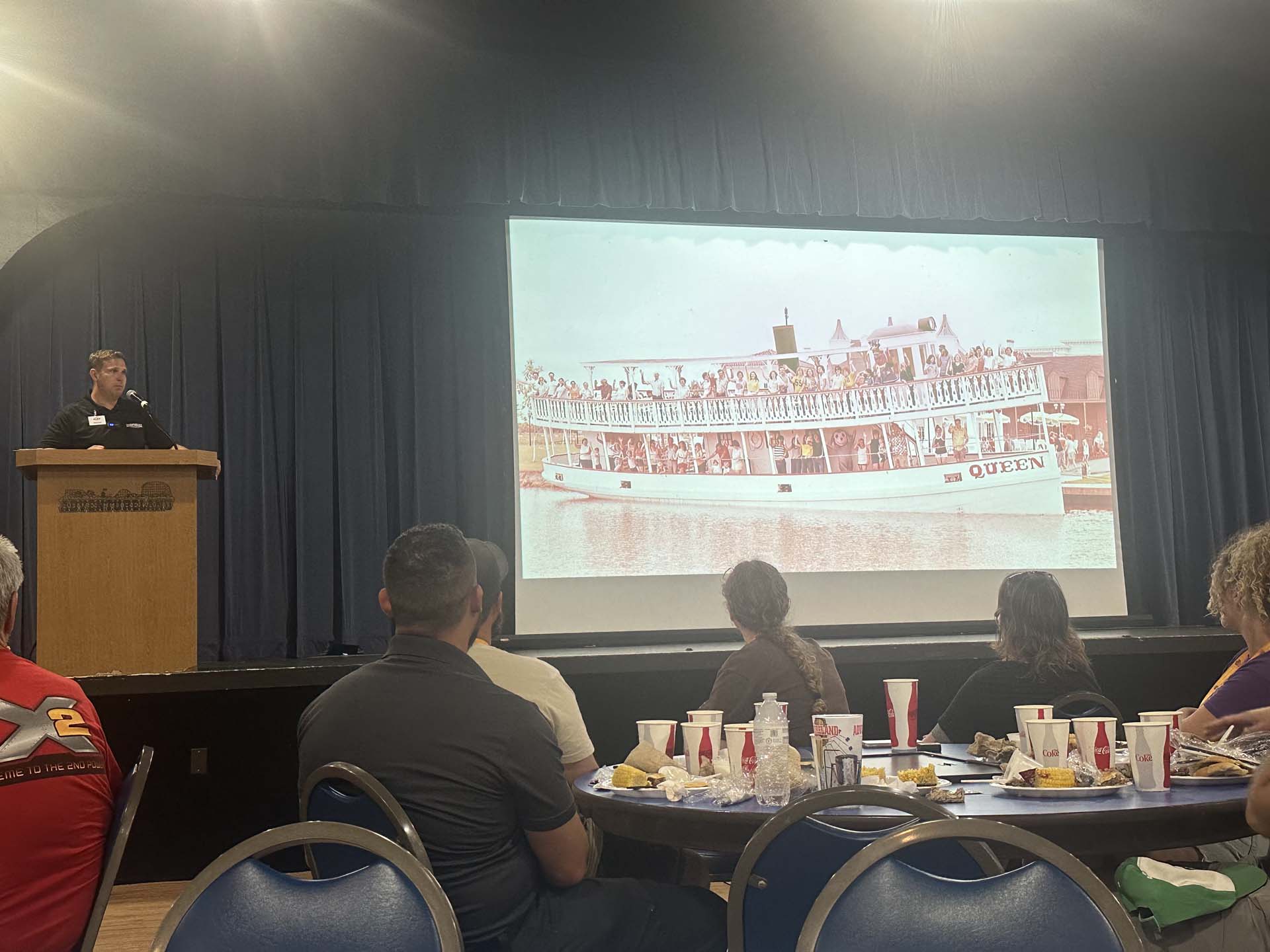 For the afternoon, a group photo and two BTS experiences were scheduled. The first allowed attendees to explore the maintenance shop, and the second was an extensive walking tour of Adventureland that began at the train station. Adventureland is a Palace Entertainment-owned park that took its original design and layout inspiration from Disneyland. Although the station and Main Street were influenced by Disneyland, the buildings on Main Street were inspired by early buildings in Iowa. Details about defunct and current rides and structures were shared as attendees walked through the park, all of which piqued their curiosity for the park history presentation later during dinner.