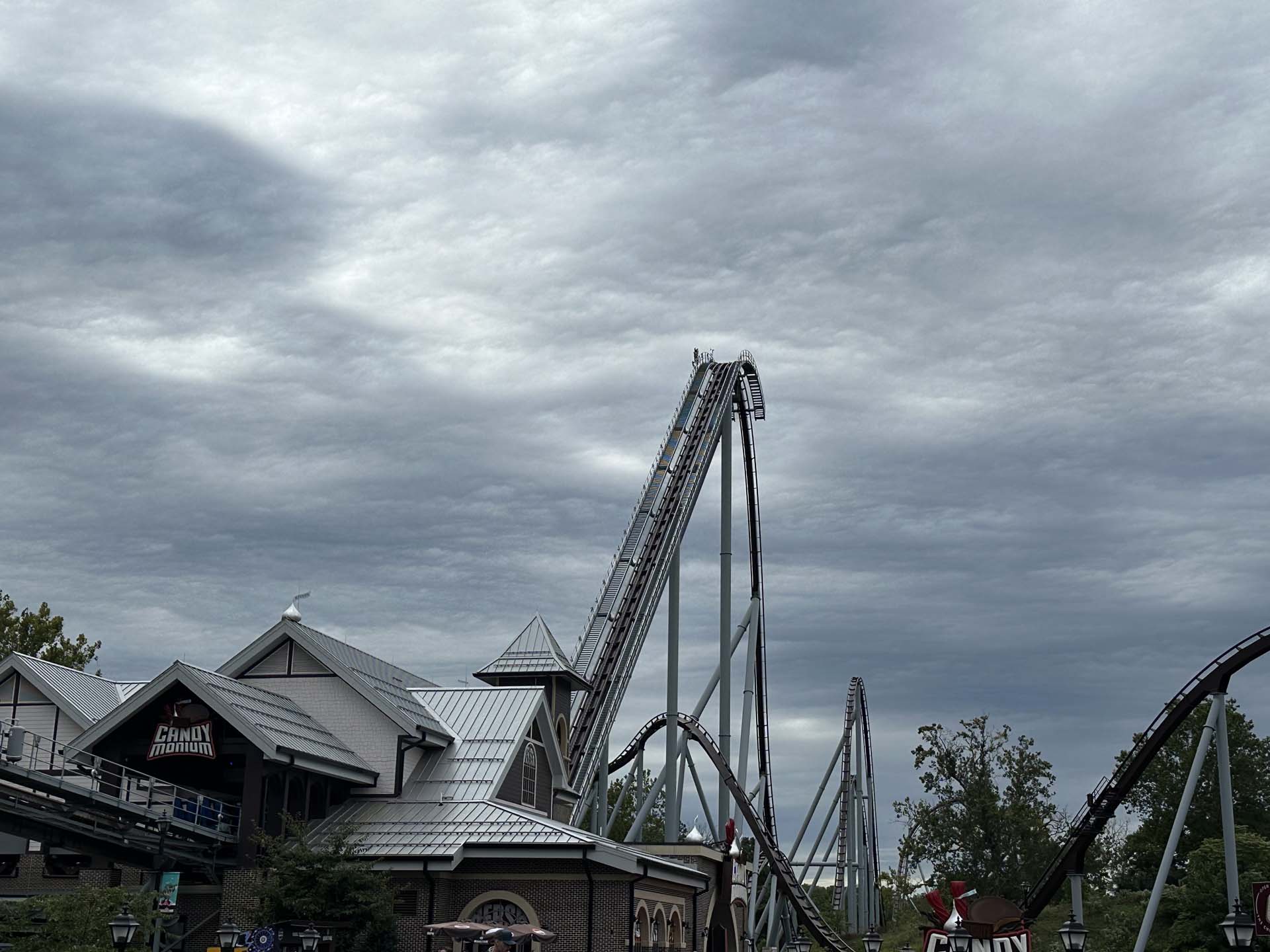 Storm clouds loom over Candymonium — one of the coasters that is part of Hersheypark’s Sweet Start early entry.