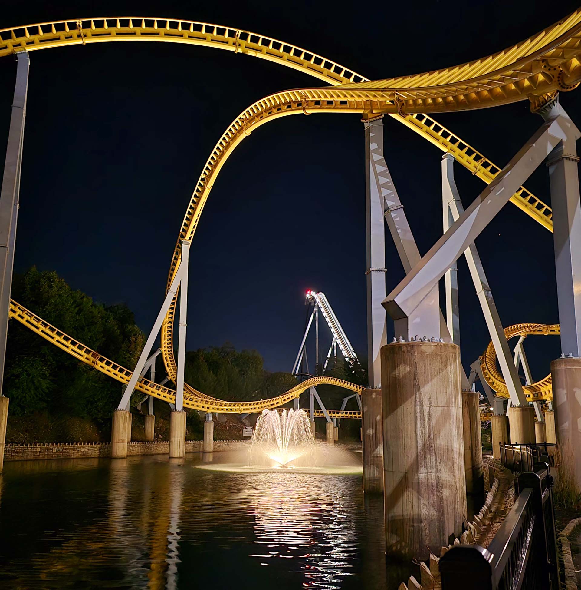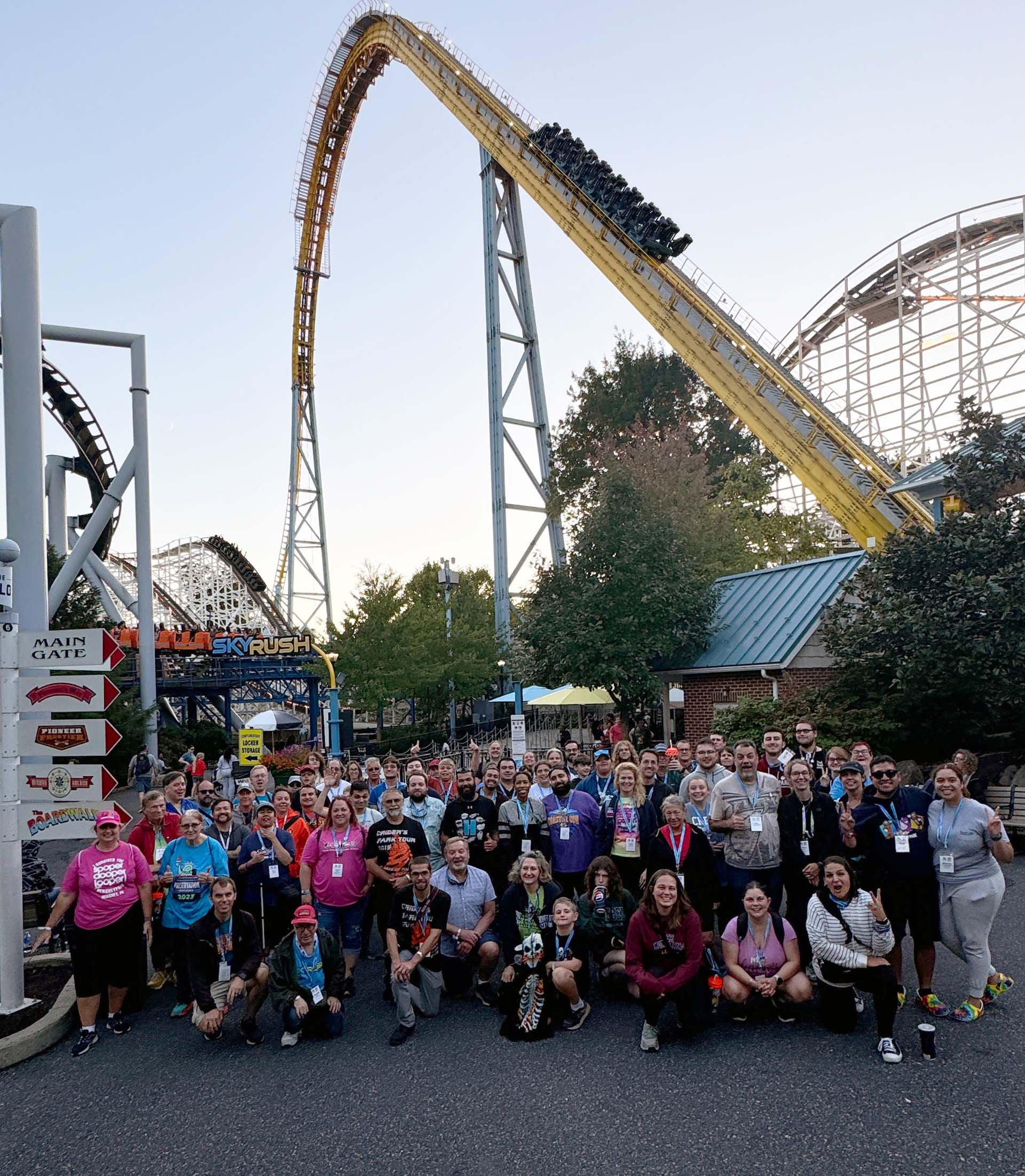 The group photo, which was originally scheduled for the morning but had to be moved to the evening, was taken at Skyrush‘s entrance. Skyrush plus Comet, Great Bear and sooperdooperLooper added to a coaster-filled backdrop at sunset.