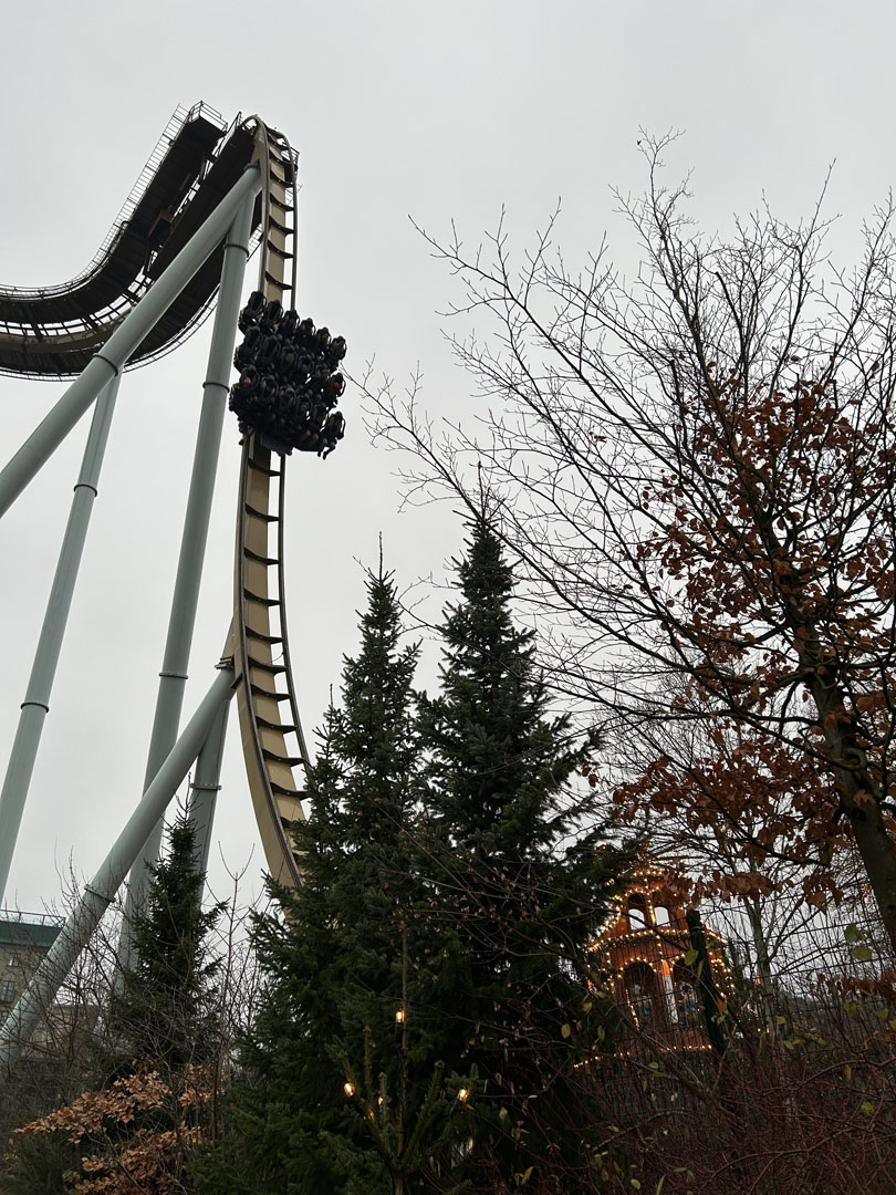With easy access from the Gothenburg airport via frequent shuttle buses, Liseberg poses a dramatic sight when approaching on the motorväg. Three coasters cover the hillside along the side of the park, and two more appear alongside the highway. During the Christmas season, the park runs Balder, a recently retracked Intamin woodie, and Valykyria, a gracefully fast and smooth Bolliger & Mabillard dive coaster. The park’s two small family coasters — Rabalder and Stampbanan — are both surprisingly fun, especially with a group of ACEers.