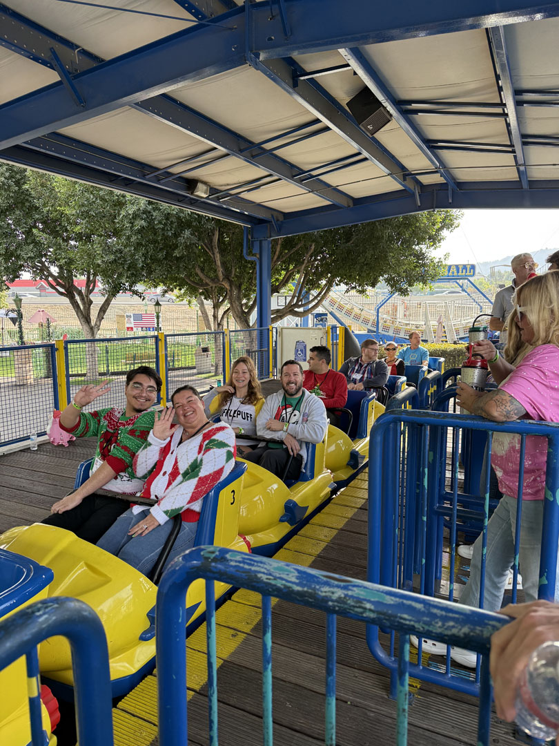 Registration began before noon because ERT on Merlin’s Revenge ran from 12 until 12:30. With the small group size hosted at a smaller park, it was nice to spend time in the queue with folks getting a chance to talk to one another. The Vekoma junior coaster was running well, and attendees enjoyed multiple rides, with some members trying to ride every row. The group then made its way to the Scrambler, which was followed by an ACE takeover on the drop tower and the train. Those on the train with an eagle eye who saw letters along the track and unscrambled them could take their answer to a booth for a sweet surprise! The pizza lunch was in a private space outside, which worked well, as the weather was quite nice for December. Those in their holiday sweaters even got a little warm! A trivia contest was held so folks could have a chance to win some Castle Park and ACE swag.