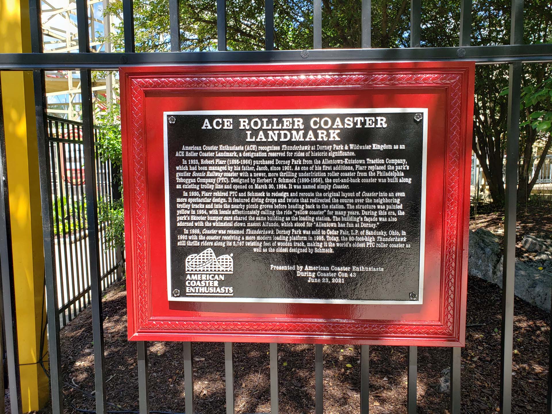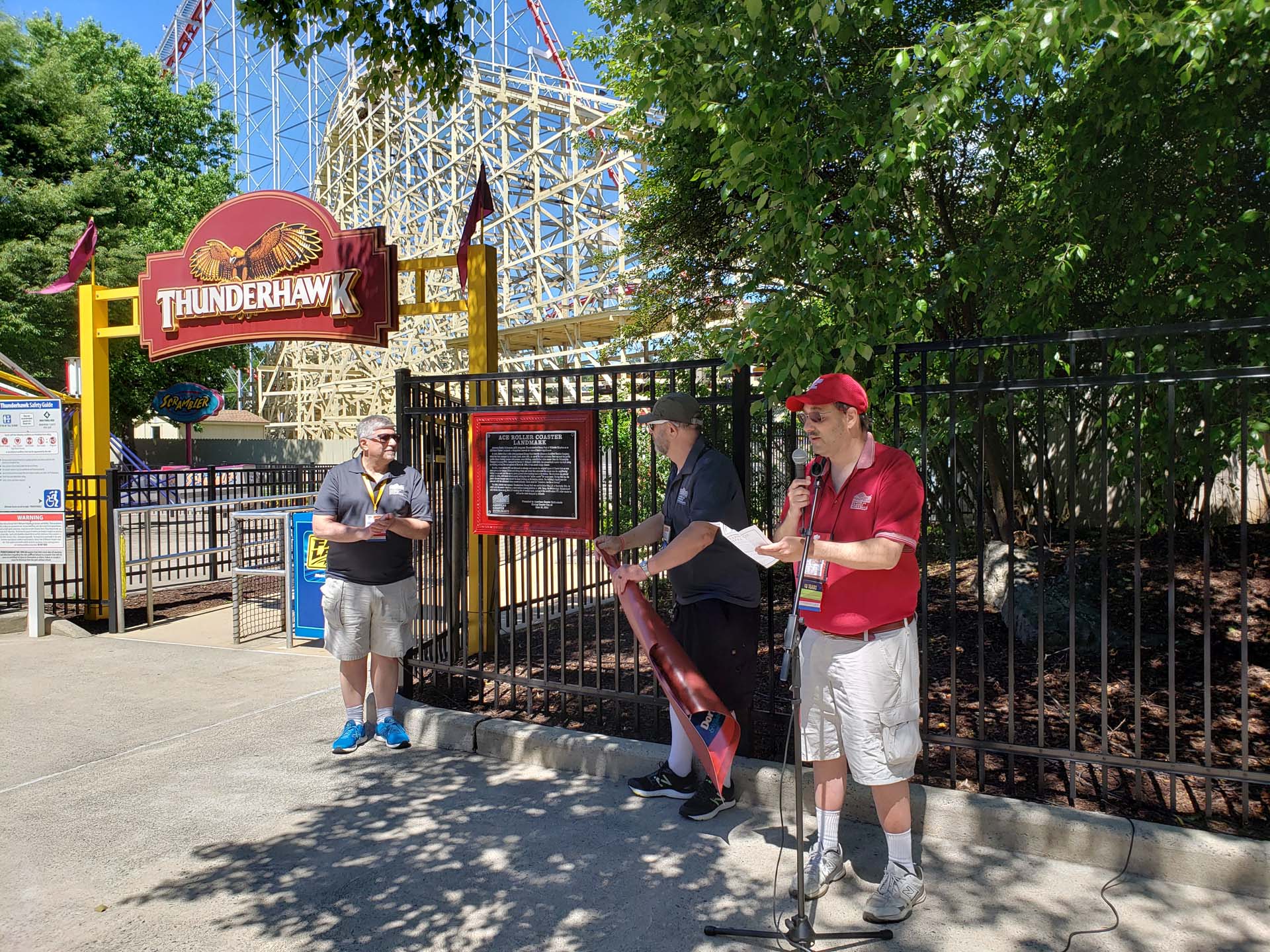 Plaques are presented at planned ceremonies, such as this one for Thunderhawk at Dorney Park in Allentown, Pennsylvania.