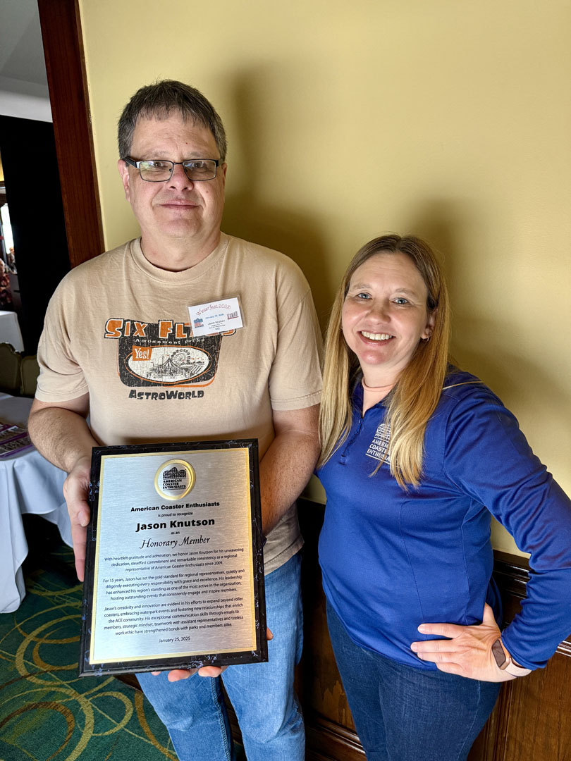 With heartfelt gratitude and admiration, we honor Jason Knutson for his unwavering dedication, steadfast commitment and remarkable consistency as a regional representative of American Coaster Enthusiasts since 2009.