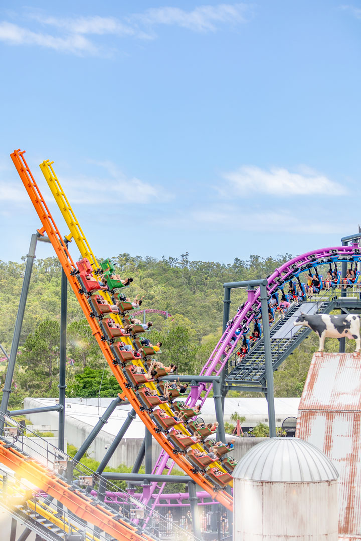 This isn’t the first time Vekoma has snarled two of its family boomerangs together. Tweestryd opened at Wildlands Adventure Zoo Emmen (The Netherlands) in 2018. The layout is duplicated at Warner Bros. Movie World, although the theme is not. The twin shuttle sports a tractor motif. One side is a red tractor on orange track; the other is a green tractor on yellow track. Both trains seat 16.