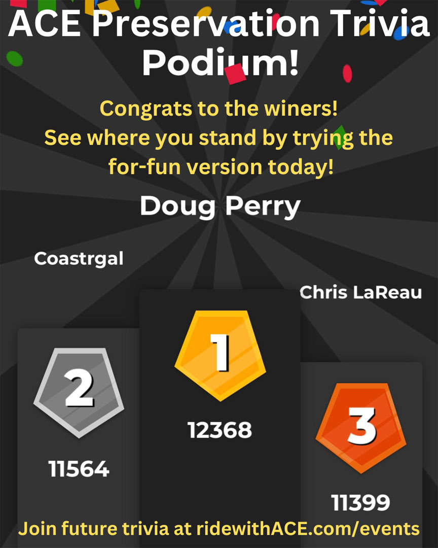 The online auction raised $1,033 for ACE’s preservation efforts. Appreciation was extended to all who participated, including those who donated items. In case you missed it, the fun and games are still available at American Coaster Enthusiasts (ACE).