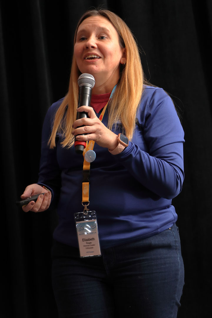 ACE’s president, Elizabeth Ringas, took the podium to review ACE’s 2024 events and honorary memberships (Rus Ozana, Robert Ulrich, Chris Kraftchick, Dave Hahner and Jason Knutson) and to recognize one of ACE’s founders, Roy Brashears, who was in attendance. In 2025 ACE will travel to Busch Gardens Williamsburg (Virginia) and Kings Dominion (Doswell, Virginia) for a spring conference; Six Flags Great America (Gurnee, Illinois), Little Amerricka (Marshall, Wisconsin) and Indiana Beach (Monticello, Indiana) for Coaster Con 47; and Six Flags Magic Mountain (Valencia, California), SeaWorld San Diego, and Belmont Park (San Diego, California) for the preservation conference. ACE will have a new member engagement platform, and Ringas mentioned some current volunteer needs.