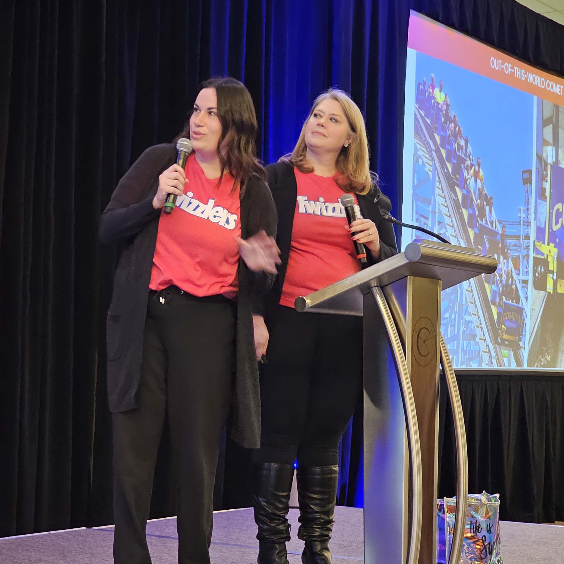 The first park presenters were Quinn Bryner (director of public relations) and Amanda Polyak (public relations manager) from Hersheypark in Hershey, Pennsylvania. Recapping 2024, they mentioned the new seats for Skyrush, new trains for Comet, 50 years of Hershey characters and the new Santa and reindeer experience. Looking ahead, 2025 will be Hersheypark’s 119th operating year, and the park will welcome Twizzlers Twisted Gravity – the tallest screamin’ swing in the world at 137 feet. Speed will be 68 mph. Bryner and Polyak ended their presentation with a trivia contest and an announcement of free single-use Fastlane passes at Hersheypark for Eastcoaster attendees.