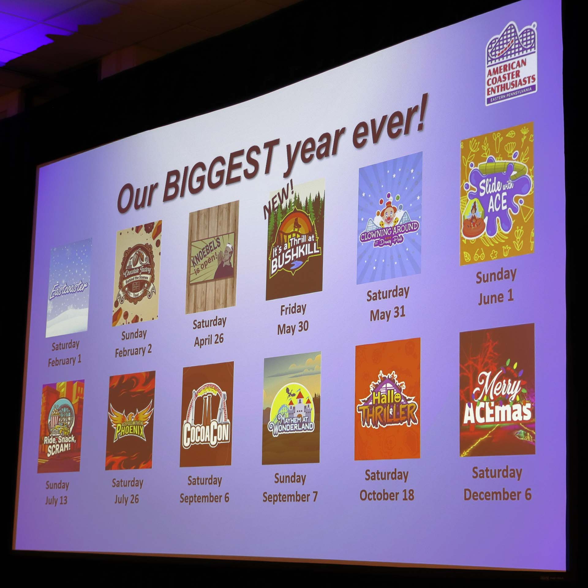 If that weren’t impressive enough, Matscherz announced that Eastern Pennsylvania was planning 12 events for 2025: The Hershey Chocolate Factory Behind-the-Scenes Tour was scheduled for Sunday, followed by Knoebels Is Open (Eastern Pennsylvania is in charge of Knoebels opening day event); It’s a Thrill at Bushkill (new!); Clowning Around at Dorney Park; Slide with ACE; Ride, Snack, SCRAM! (the new name for Sunny Days With ACE); ACE Flies With the Phoenix; CocoaCon; Mayhem in Wonderland; Hallo Thriller; and Merry ACEMas. In 2026, the region is planning a three-day event in July to celebrate Knoebels’ 100th anniversary: ACE Flies With Knoebels. And don’t forget to check out the new regional T-shirt.