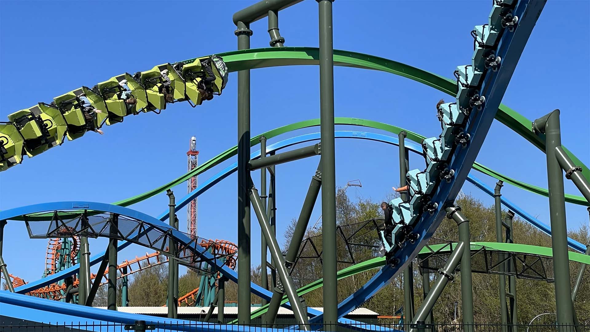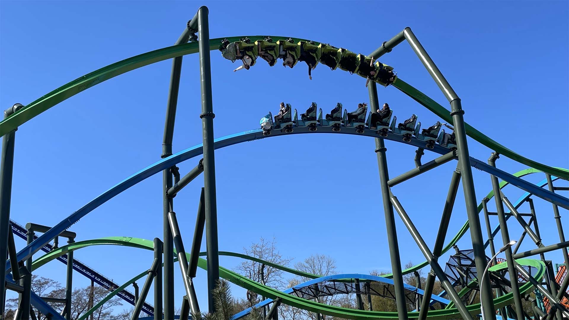 The more intense thrills of the green “Thrill” track include inversions such as corkscrews.