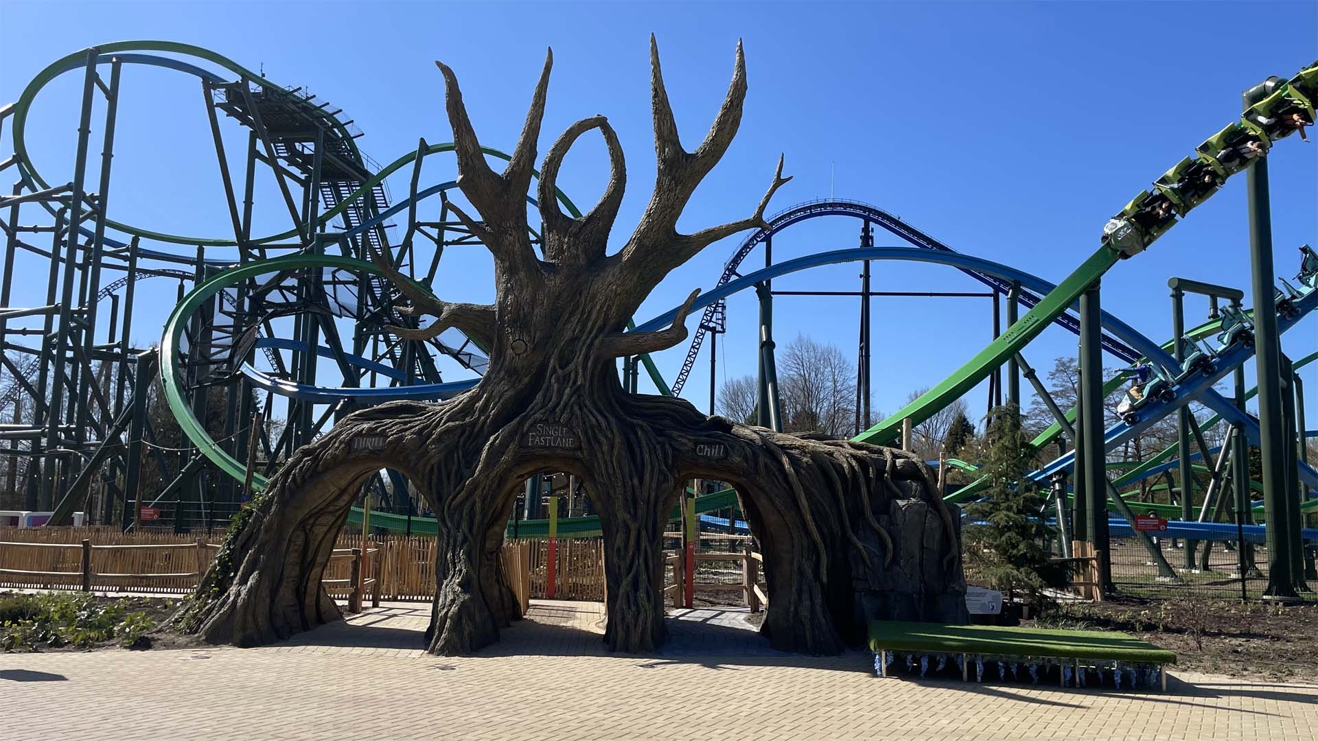 With green symbolizing nature and blue symbolizing water, YoY’s theming is unique. The entry icon is constructed from wood left over from when the park’s Robin Hood coaster was transformed into Untamed.