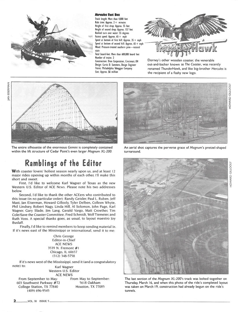 Speaking of record-breaking wood coasters, another that would end up not being long for this world was featured on the cover. Hercules was arguably the ride that transformed Dorney Park (Allentown, Pennsylvania) from a smaller traditional park to a regional theme park that ended up being purchased by Cedar Fair a few years later. The result of Charlie Dinn and Curtis Summers’ late eighties/early nineties collaboration, it would advertise a massive hillside drop as its claim to fame.