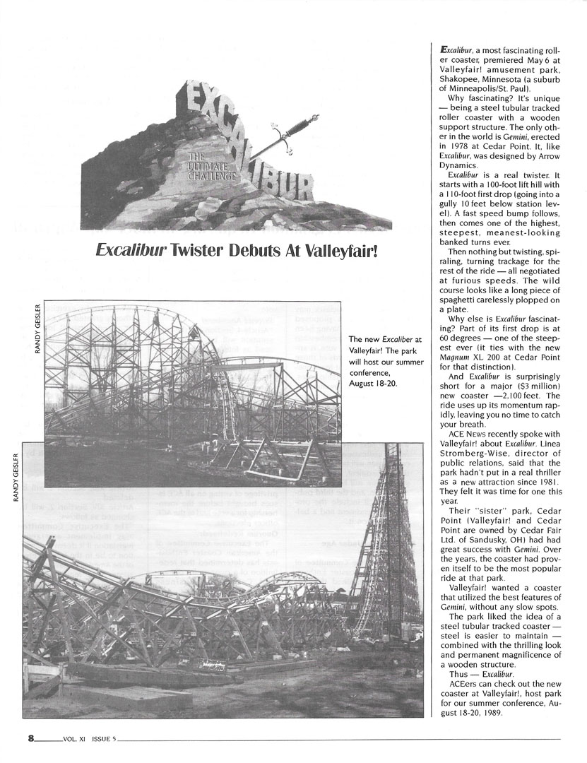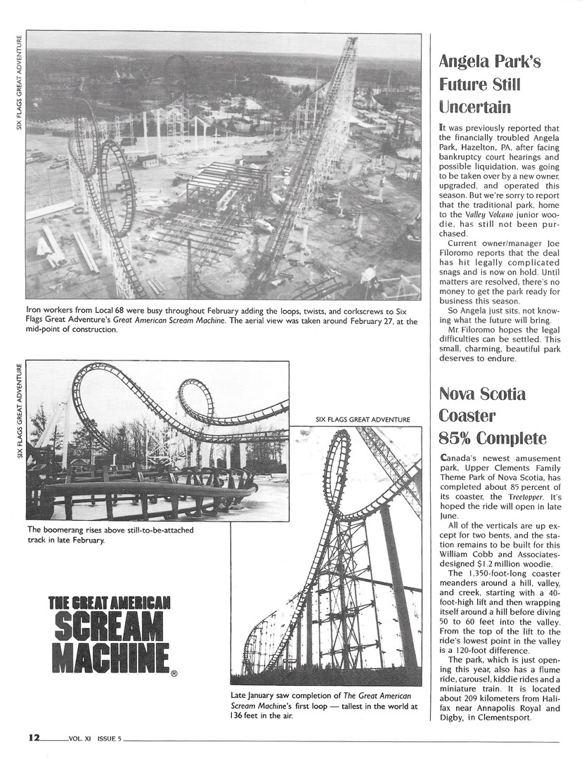 Since B&M wasn’t yet in the business of creating roller coasters outside of Giovanola, this issue of ACE News highlights a lot of the work of Arrow Dynamics, including two extreme examples of technology dating back to its groundbreaking 1966 Runaway Mine Train. At first glance, Excalibur at Valleyfair (Shakopee, Minnesota) and Magnum XL-200 at Cedar Point (Sandusky, Ohio) couldn’t be more different from each other, but both were nonlooping steel coasters that pointed the way forward for the amusement industry. These days, it’s difficult imagining a theme park without a nonlooping roller coaster stretching precariously into the skies. And for those who enjoy being thrown upside down, there is also an update on Six Flags Great Adventure’s Great American Scream Machine that would debut for the 1989 season in Jackson, New Jersey.