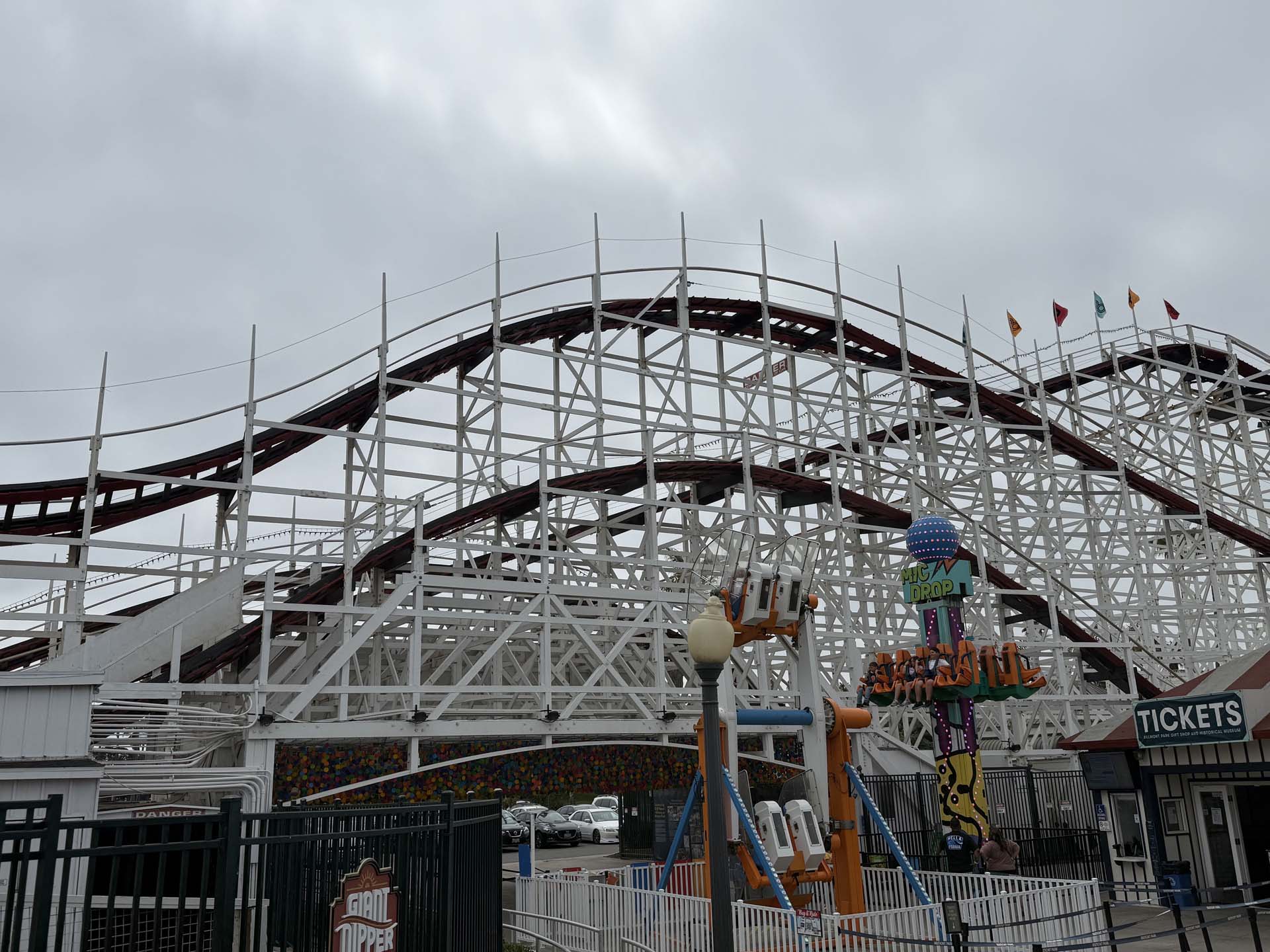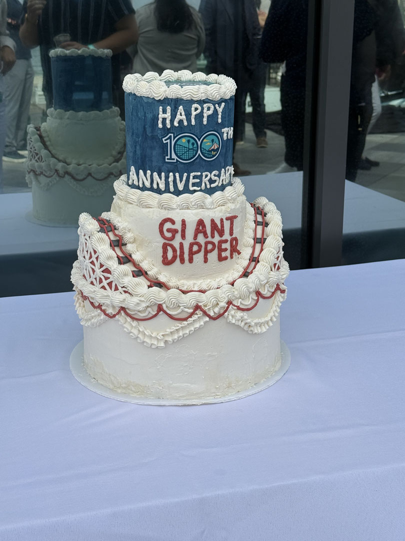 Steve Thomas, general manager of Belmont Park, welcomed the crowd and talked about the history of the park and Giant Dipper. The roller coaster was designed by Frank Prior and Frederick Church and has a storied history. It closed briefly from 1955 until 1956 owing to a fire that broke out in the engine room and burned the loading area and several cars. The coaster was also famously closed from 1976 through 1990.