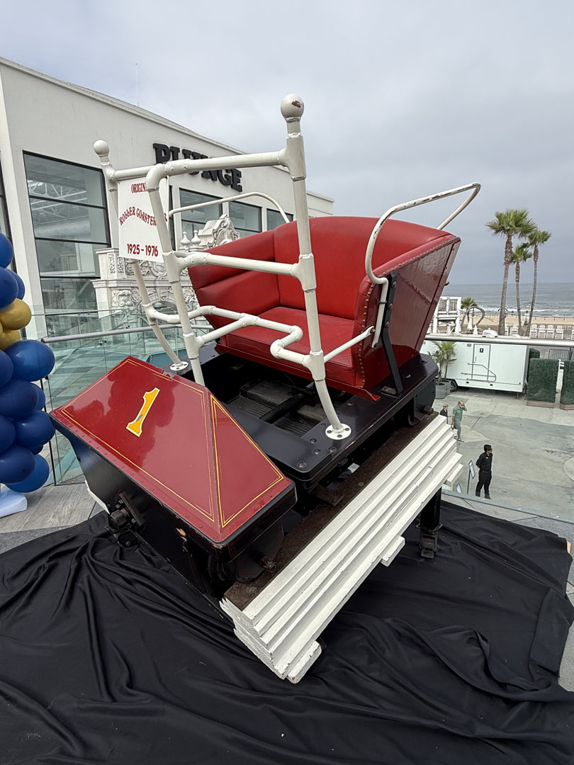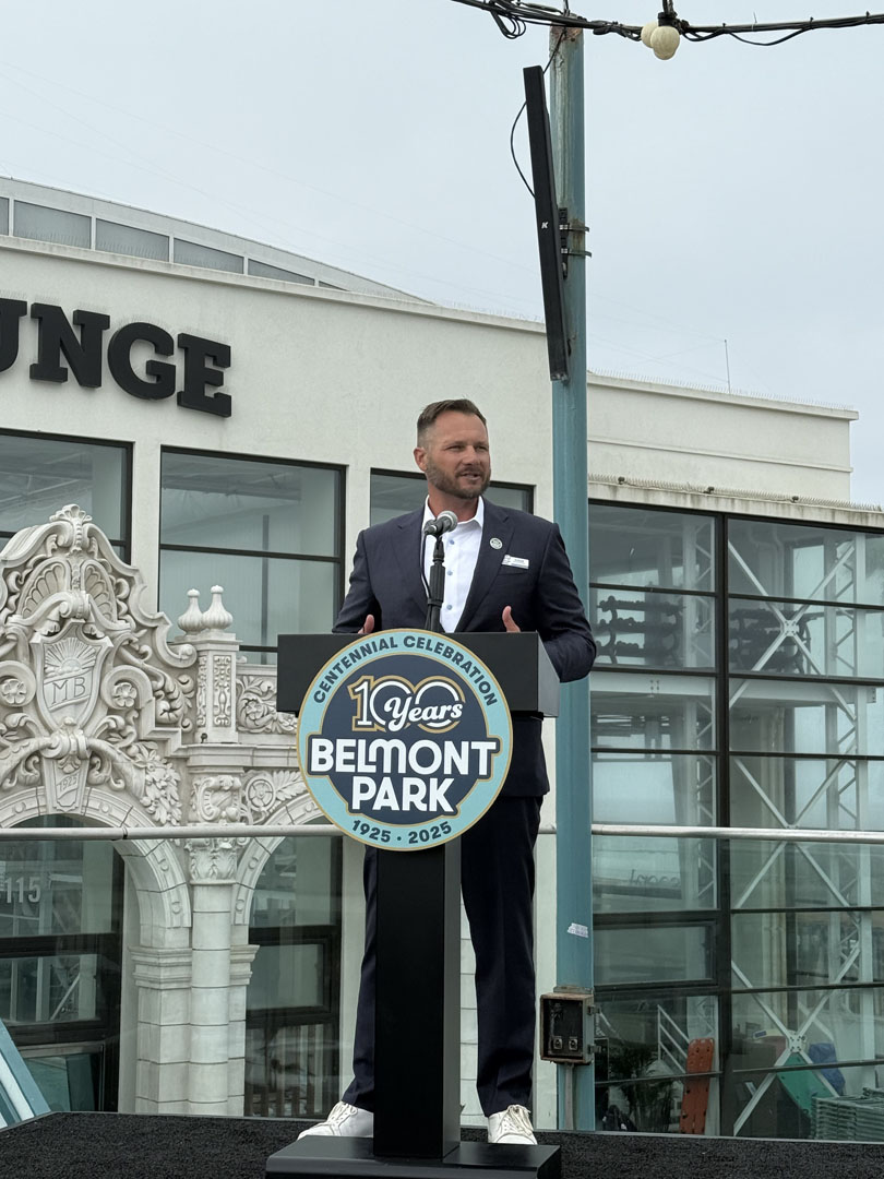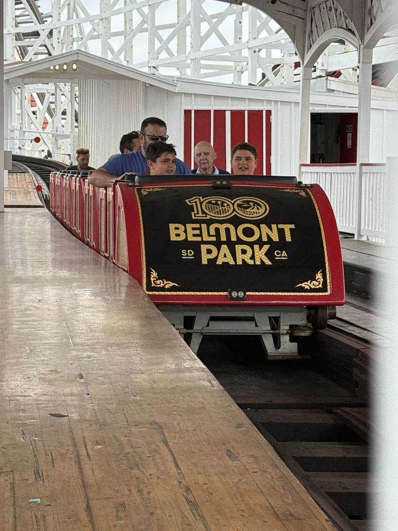City of San Diego Mayor Todd Gloria then spoke and announced that July 1, 2025, was officially Belmont Park Day. Other local and state government officials presented Belmont Park with documents of congratulations. The author of this article also spoke about the coaster and about how exciting it is to have this landmark coaster in her own backyard, after which she gave the group a lesson on how to ride a wooden coaster — hands up all the way!