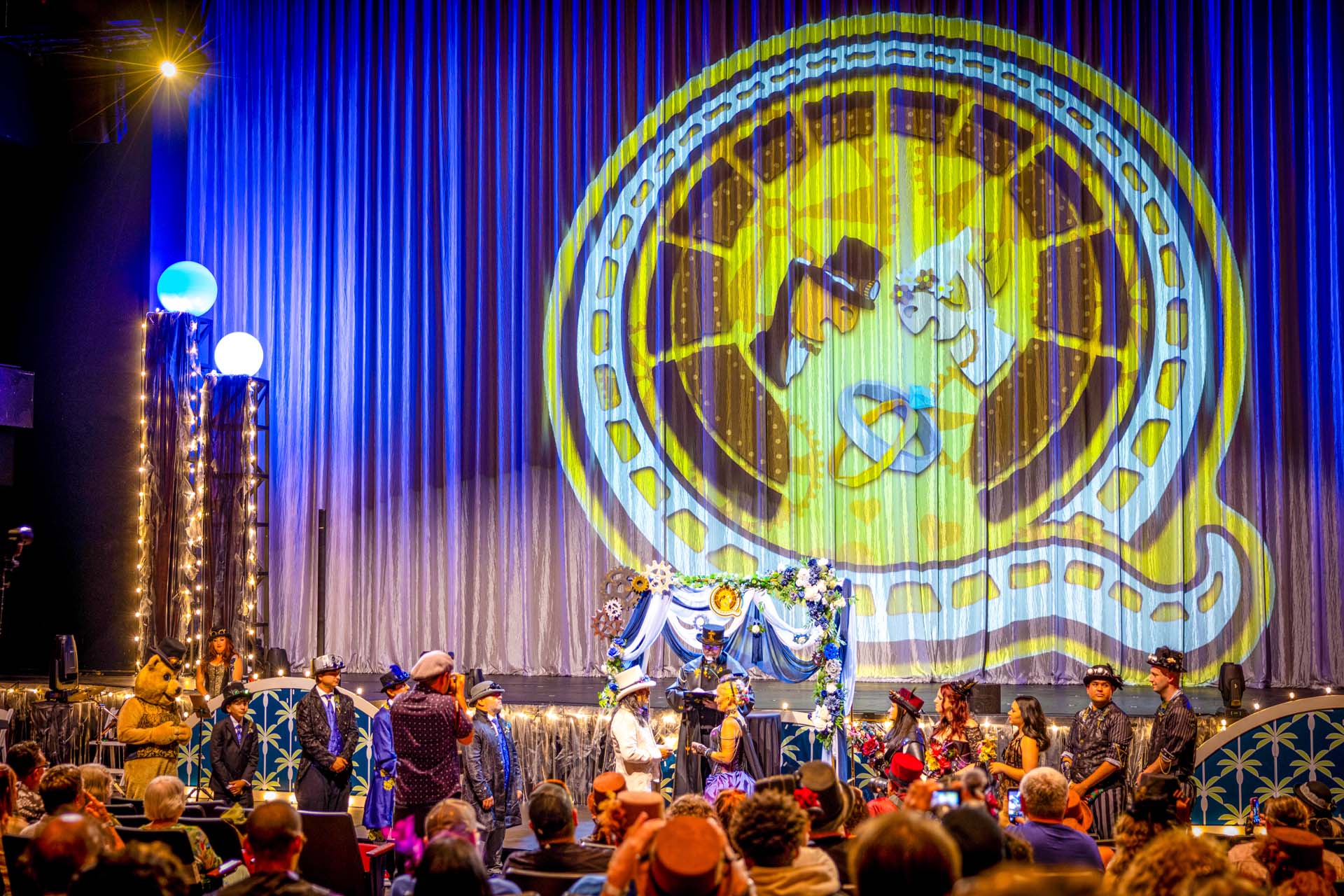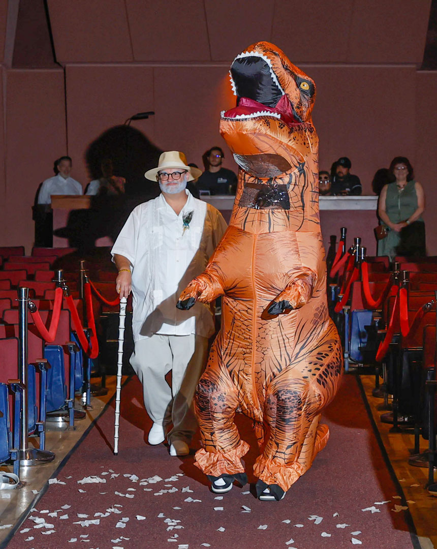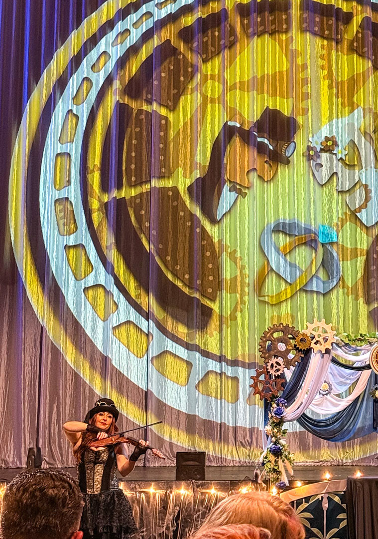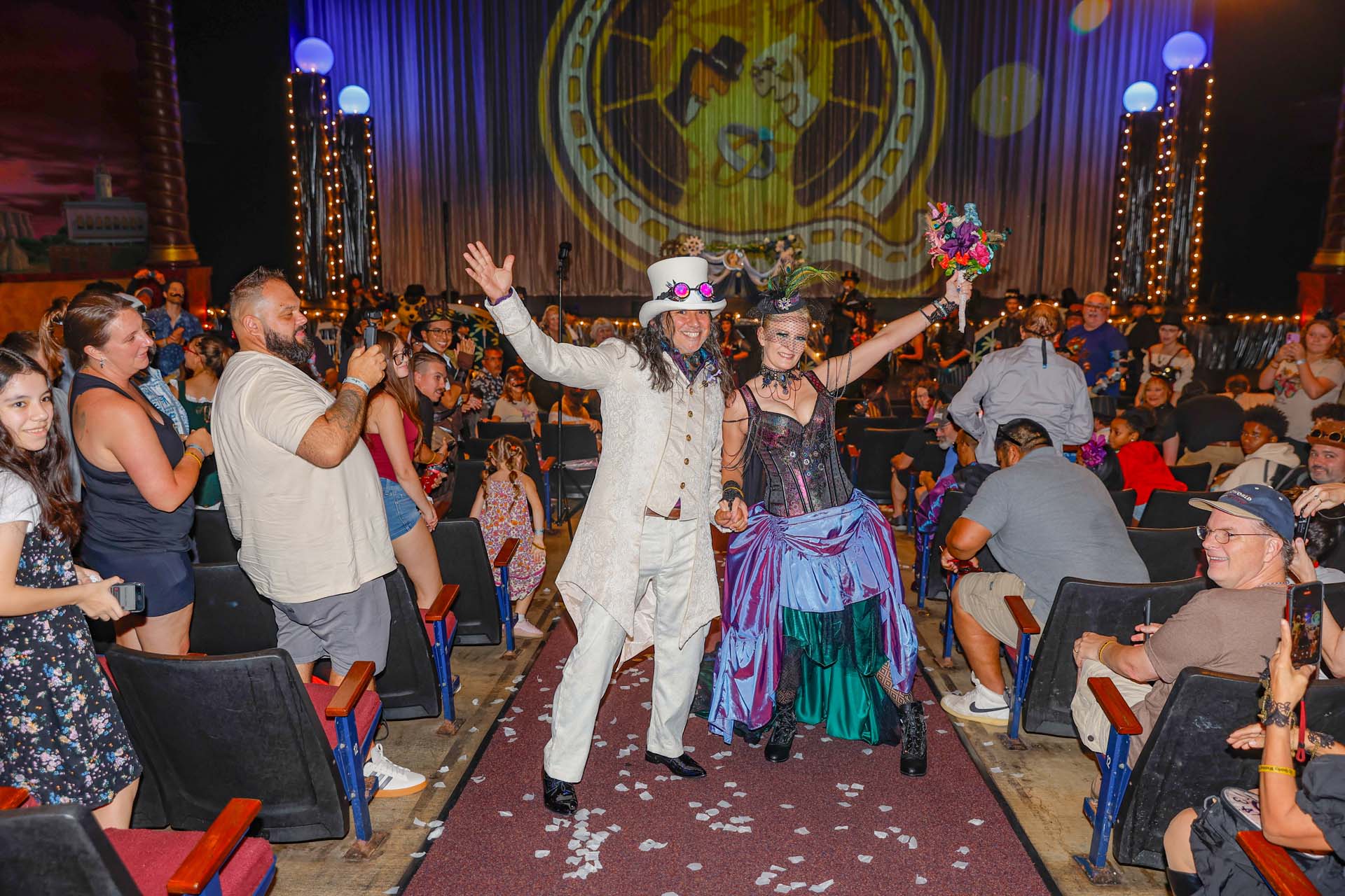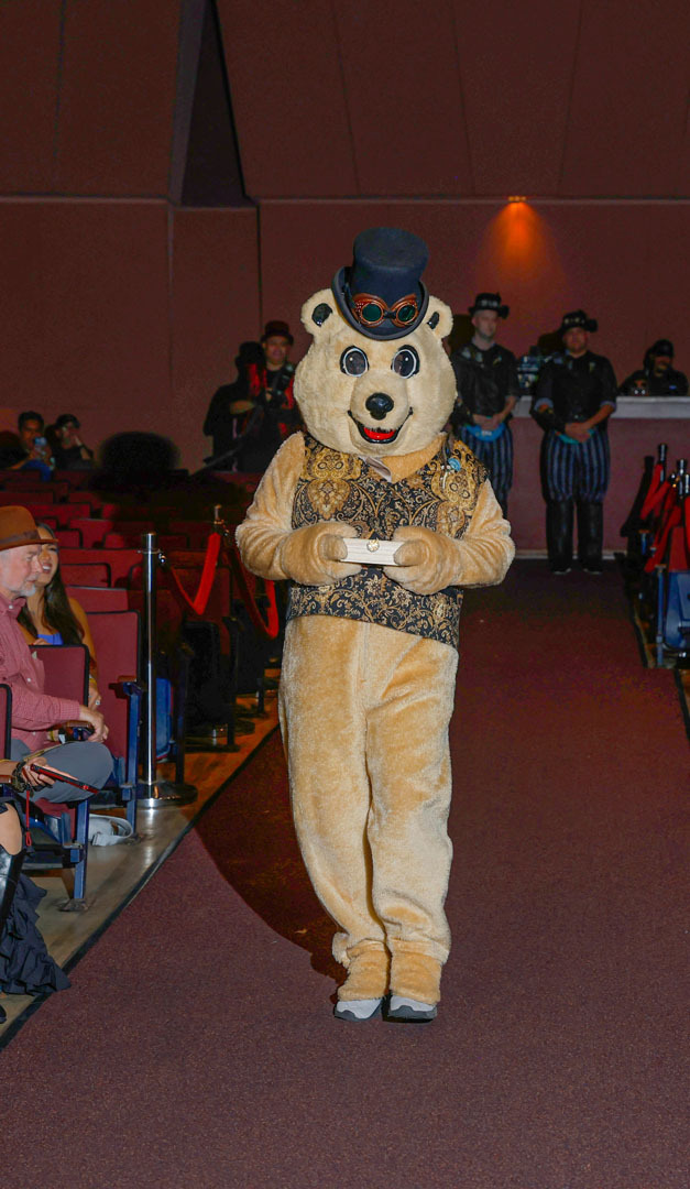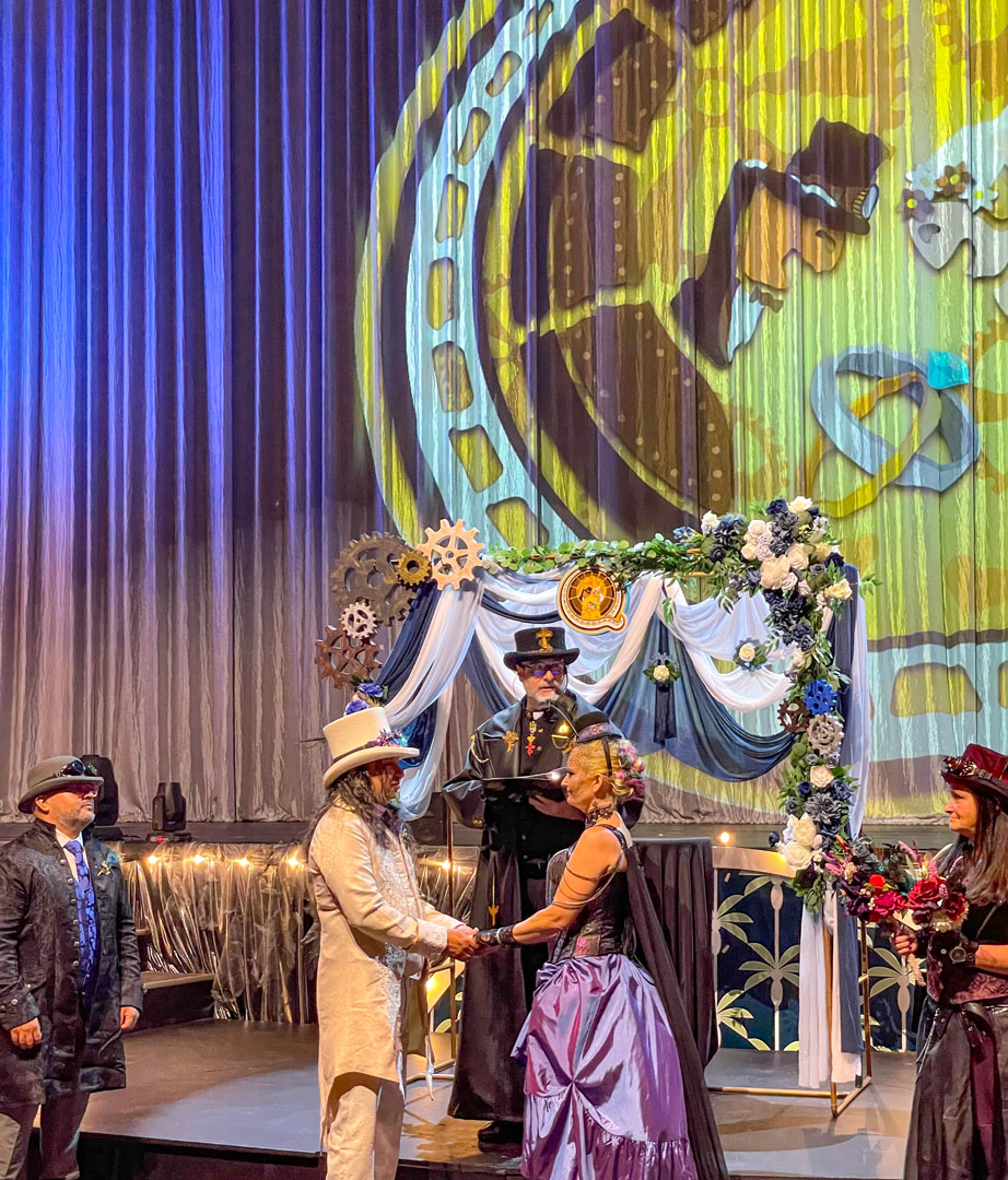 Many attendees arrived in steampunk garb, and the wedding party looked both sharp and ultra-cool. Audience members could only beg to wear those outfits at some point in their lives. An electric violinist played beautiful music as guests entered the Zaragoza Theater. As the ceremony began, it was clear, this wedding was one for the books. It wasn’t a ring bearer, it was a ring bear — which everyone was delighted to see — a bear walking down the aisle! Along with a dinosaur trailing the bride. ACE South Central Assistant Regional Rep Chip Sieczko was the official T-Rex handler.
