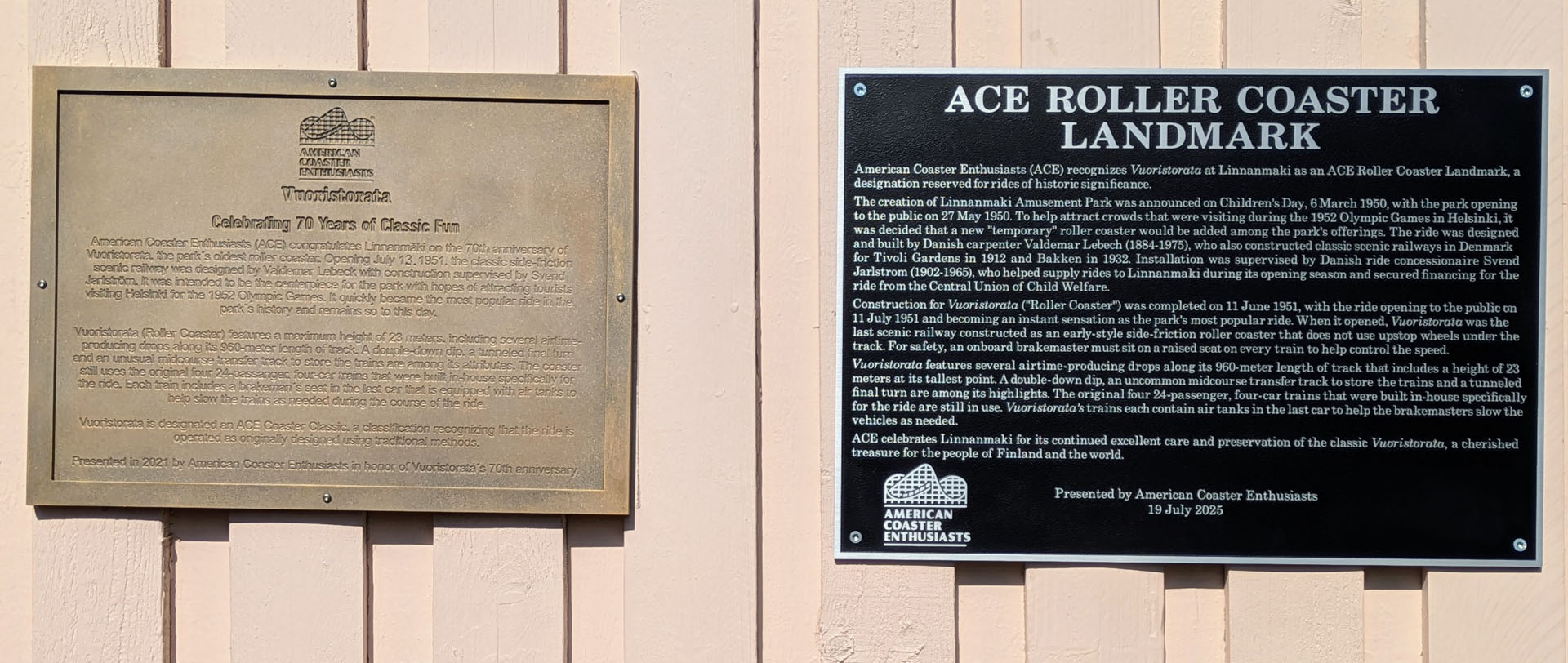 The new Roller Coaster Landmark plaque was installed after the ceremony, alongside the 2021 plaque ACE gave the park in honor of Vuoristorata’s 70th anniversary.