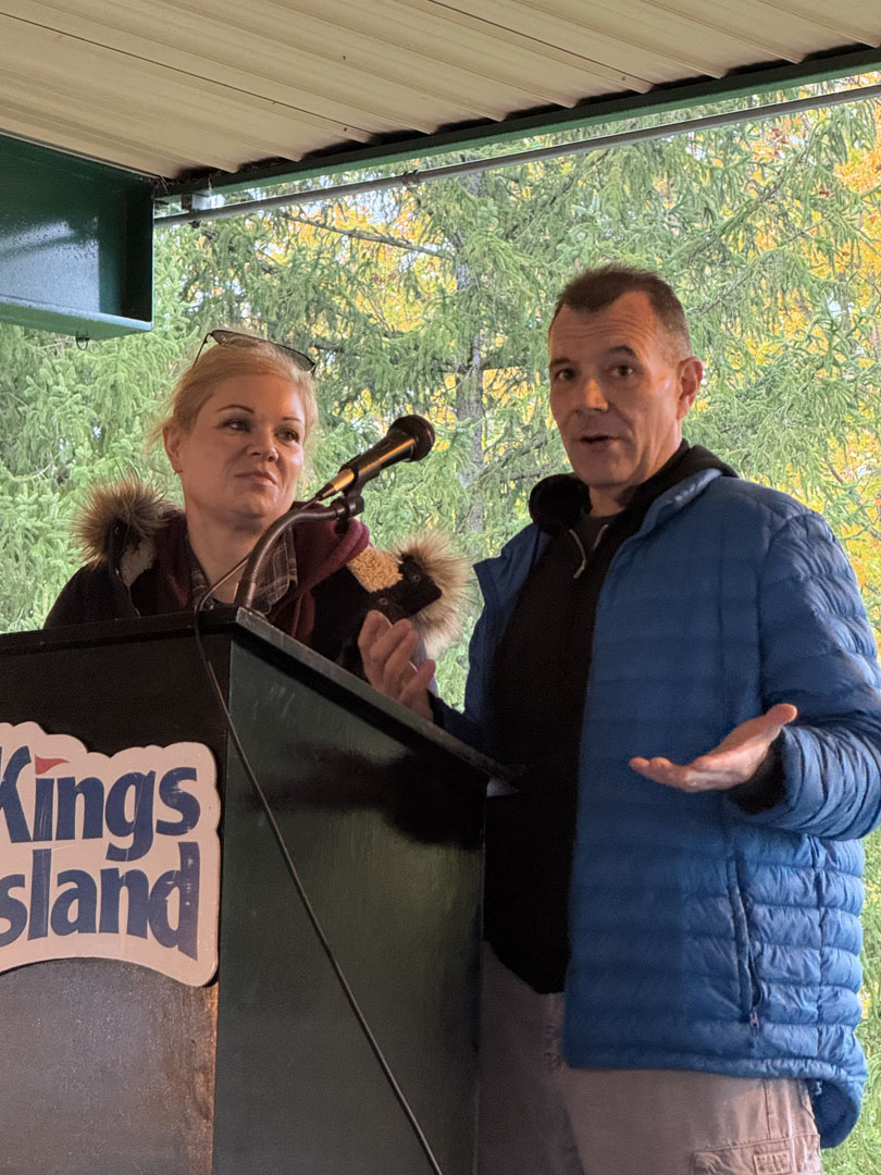 After a few thank-yous and messages from Eastern Great Lakes Regional Rep Jon Roost, a trio of guest speakers entertained attendees. Park Manager Tony Carovillano of Kings Island shared some great background and interesting Kings Island information, and Anne Irvine and Brian Ondrey of Irvine-Ondrey Engineering shared their passion for coasters and their favorite moments from working in the industry. The speakers were presented with homemade acrylic plaques as a thank you.