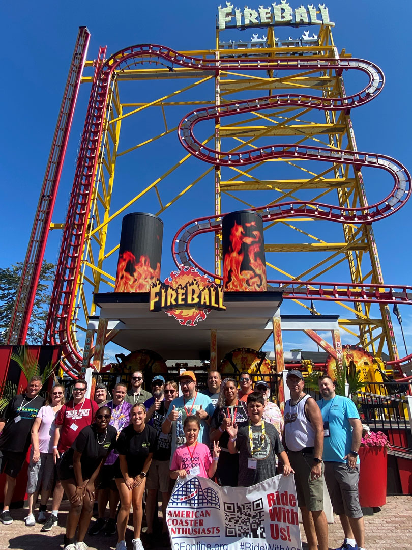 as Regional Rep May Reinert greeted every attendee personally. At 10:30 a.m., those registered for the event were escorted through the park for the first ride of ERT, Fireball. This coaster, supplied by Ride Engineers of Switzerland, is also
