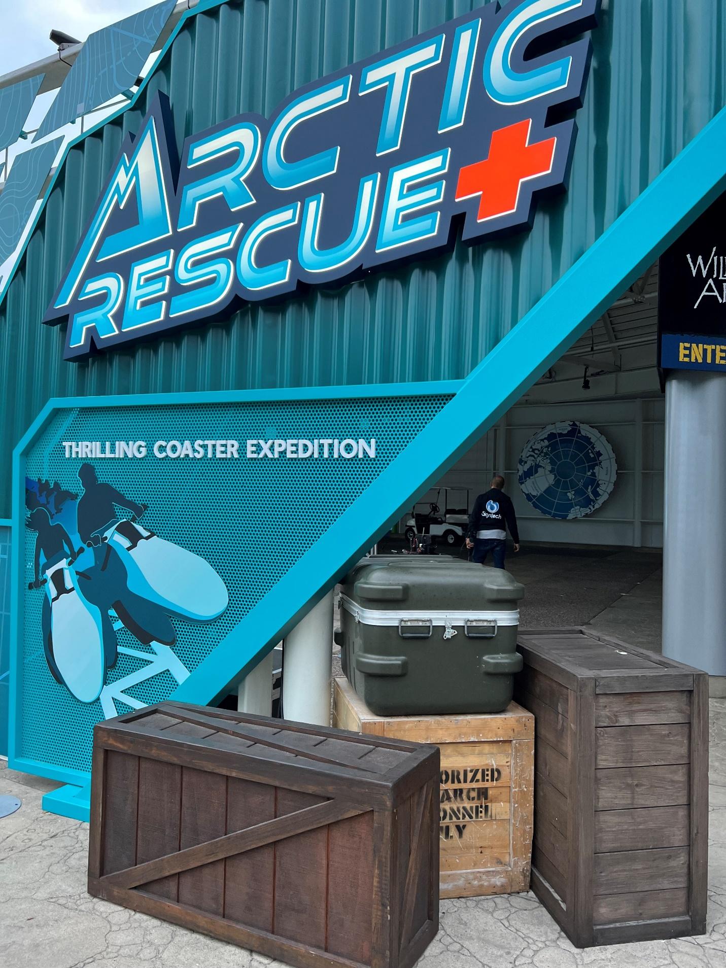 The theming reminds you of being in the Arctic with white (snow) and black ground cover. A UTV is in place ready to transport people or arctic animals in need of help. You can see a warning sign for wind gusts and there is a research station tunnel which houses the second launch. There is also a wonderful nod to the former Wild Arcticsimulator ride in the amidst the outside track. One can almost hear those blades starting up as you pass.