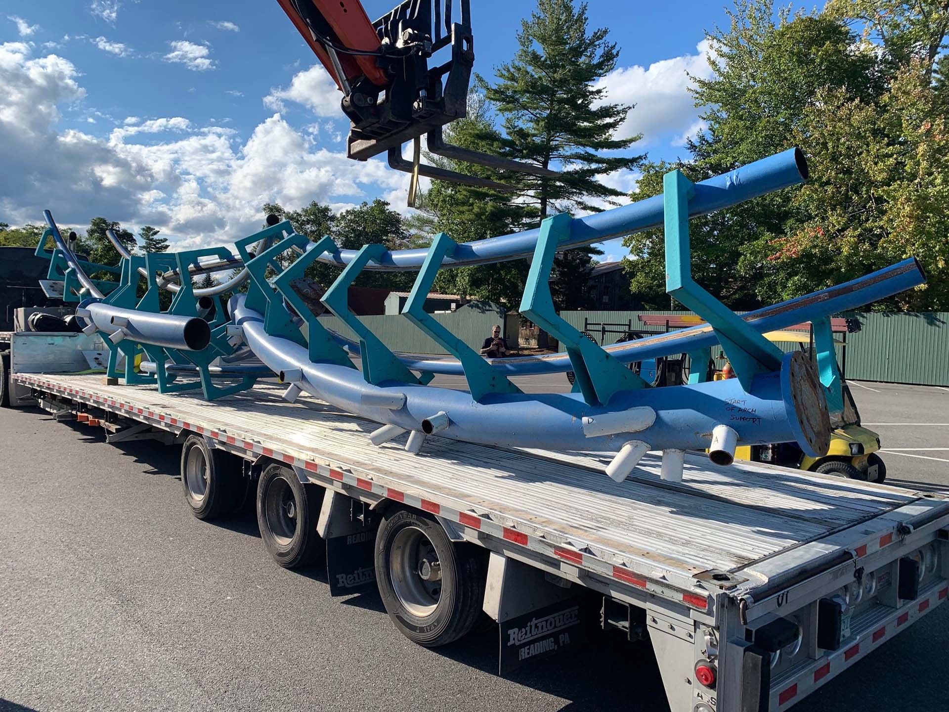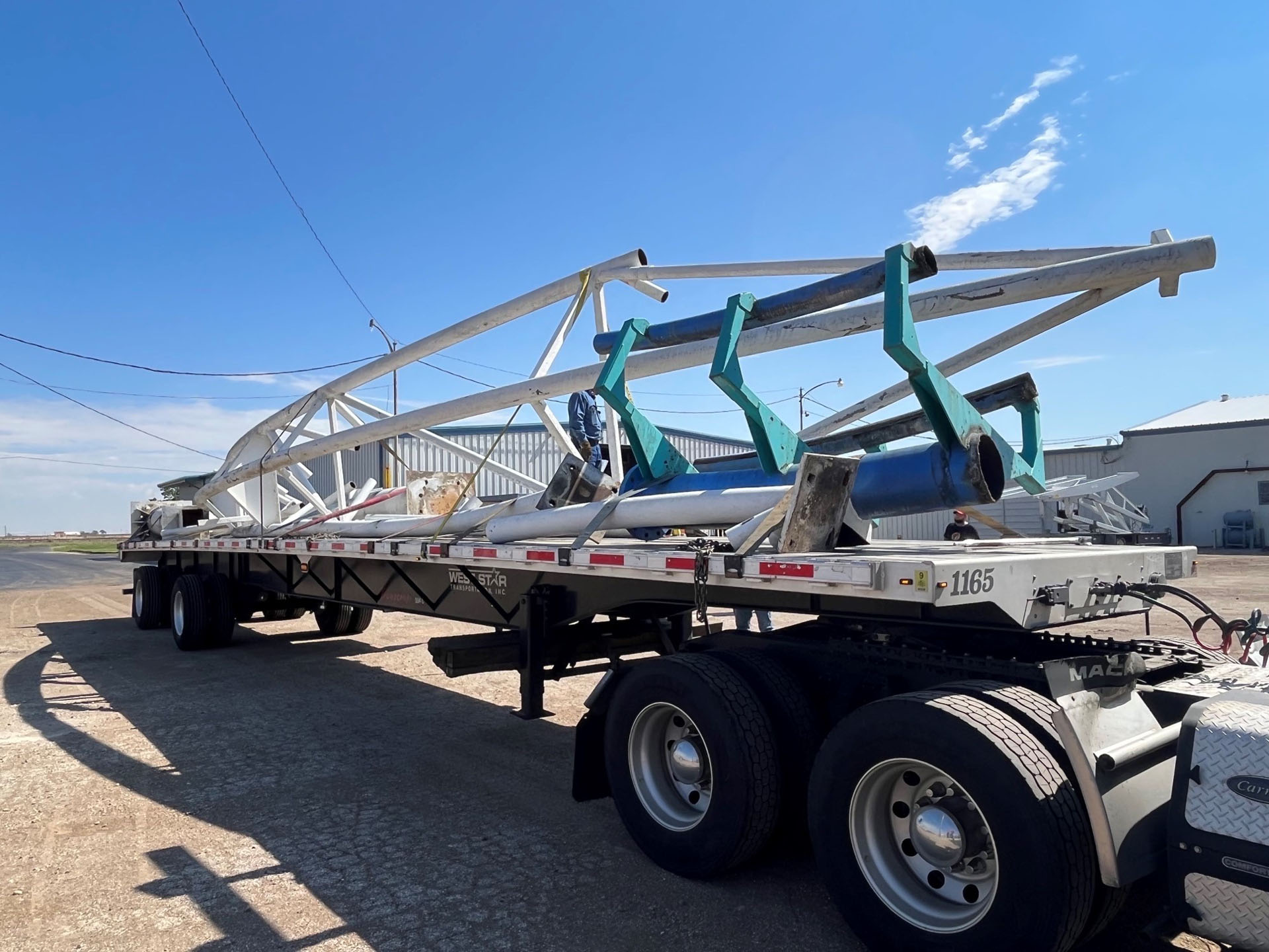 Pieces of track are loaded for transportation to Plainview, Texas.