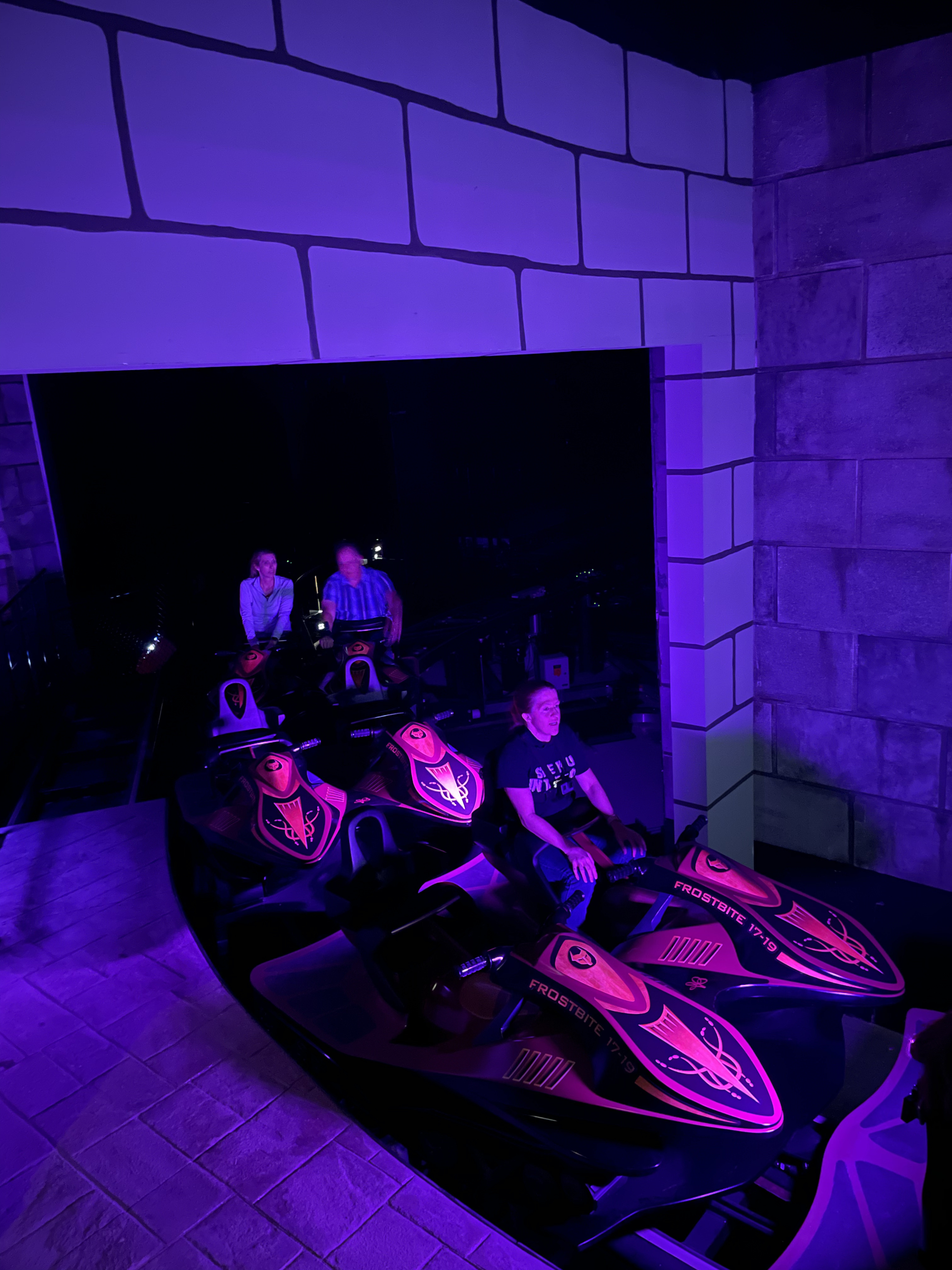Riders then experience four launches, propelling them through twists and turns integrated among themed elements that continue the story of King Ludwig, which began with The Curse of DarKastle, the previous ride housed in the space. Themed for a snowmobile, the twist and turns simulate swishing through snow-covered hills and moguls.