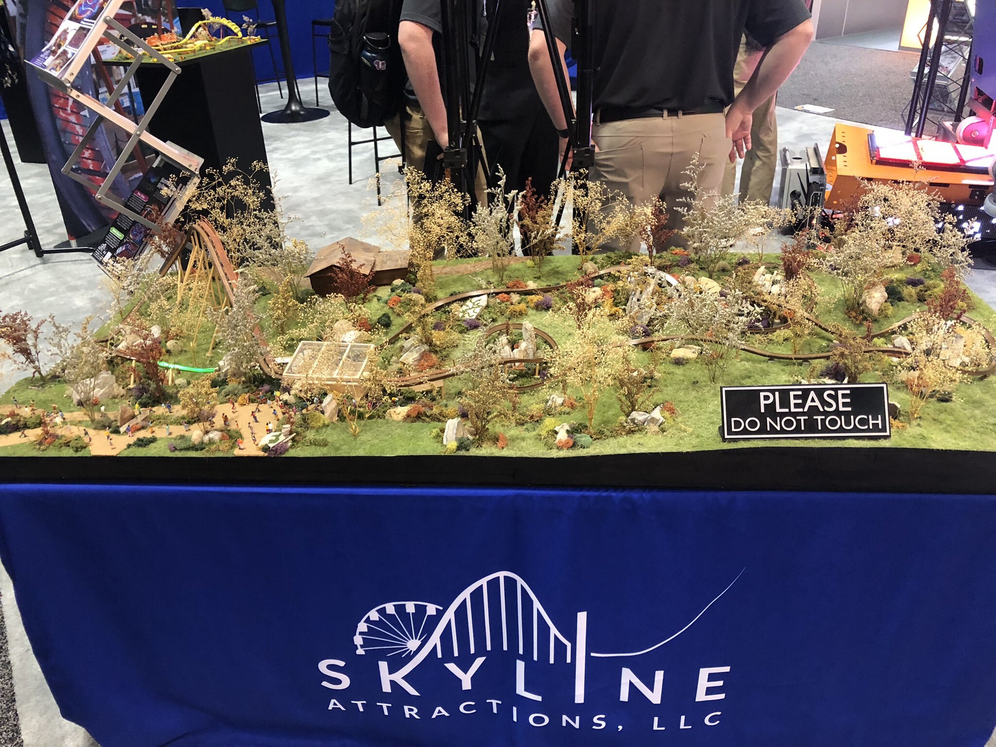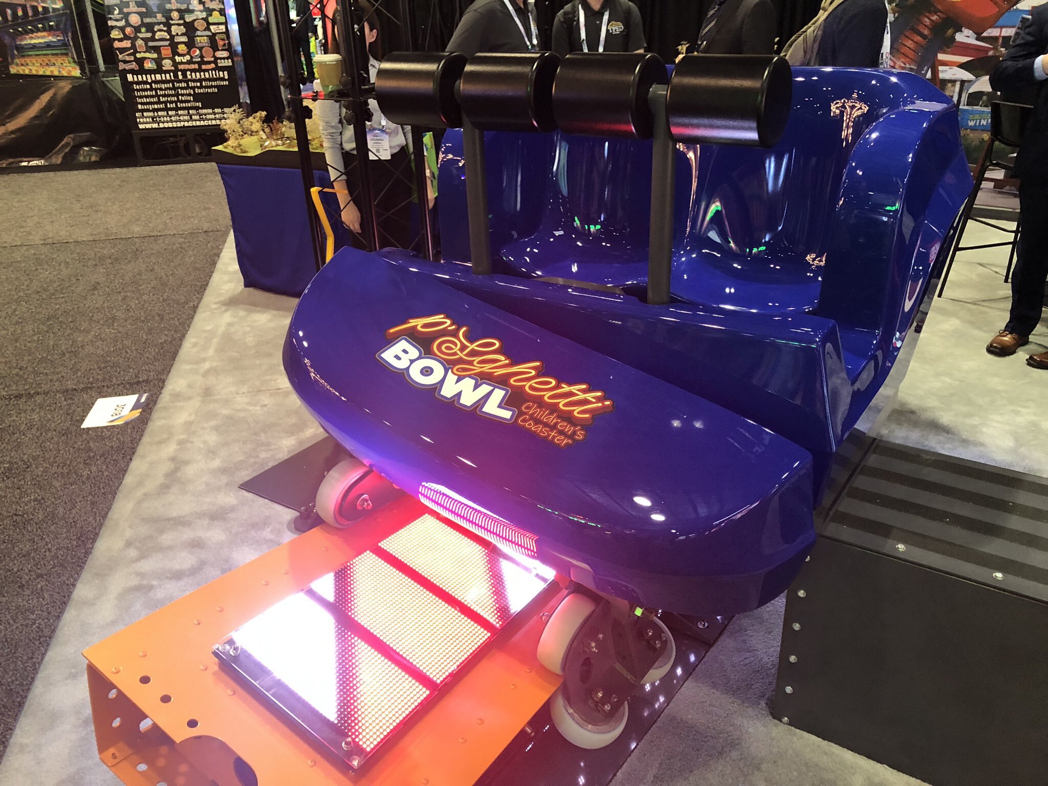 To showcase their recently-opened P'Sghetti Bowl children's coasters, Skyline Attractions' booth was redecorated with banners and a functional P'Sghetti Bowl car. The TrailRunner model with its embedded lights in the track made a return from last year as well as Skyline's various P'Sghetti Bowl layout models.