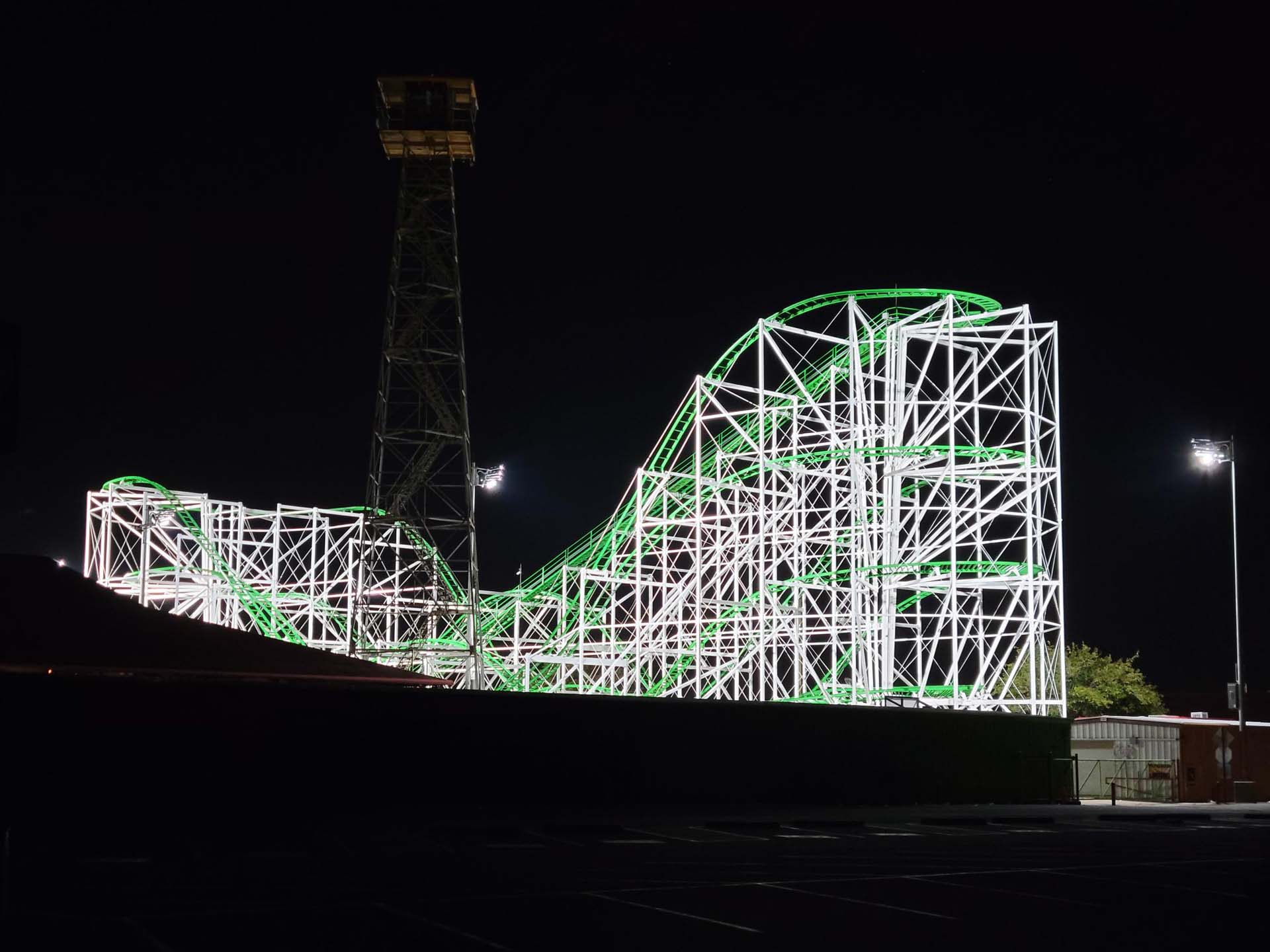 While Traders Village is only open during daylight hours, the coaster is strikingly lit at night.